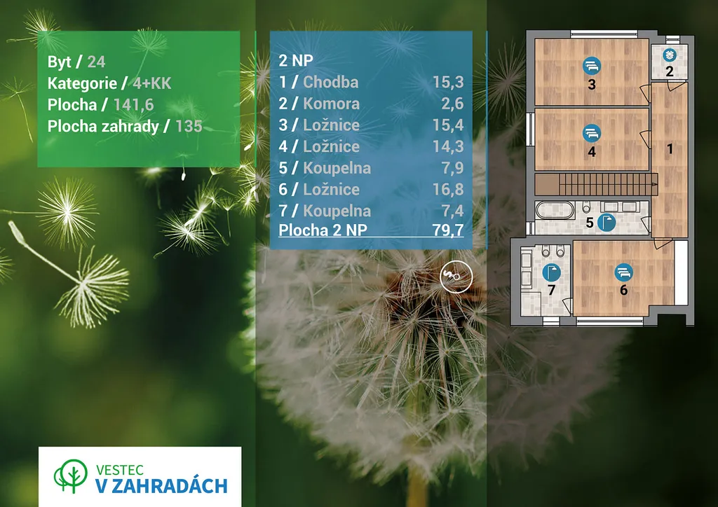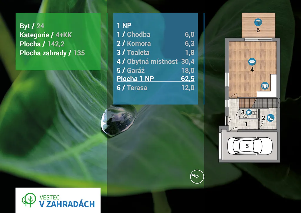 Luxusní a prostorný byt 4+kk s výhodami rodinného domu o užitné ploše cca 141,6 m², s vlastní zahradou 135 m², garáží a exkluzivním soukromím na konci slepé ulice. Součást prestižní III. etapy projektu Vestec v zahradách – ideální spojení elegance, praktičnosti a klidného bydlení jen 4 minuty od Prahy.