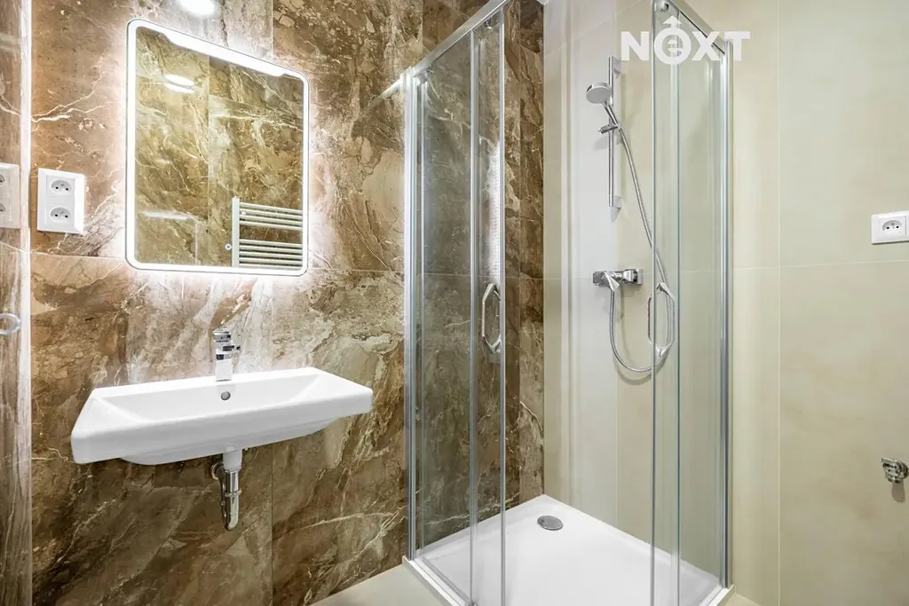 Koupelna je vybavena sprchovým koutem a umyvadlem, WC je samostatné.