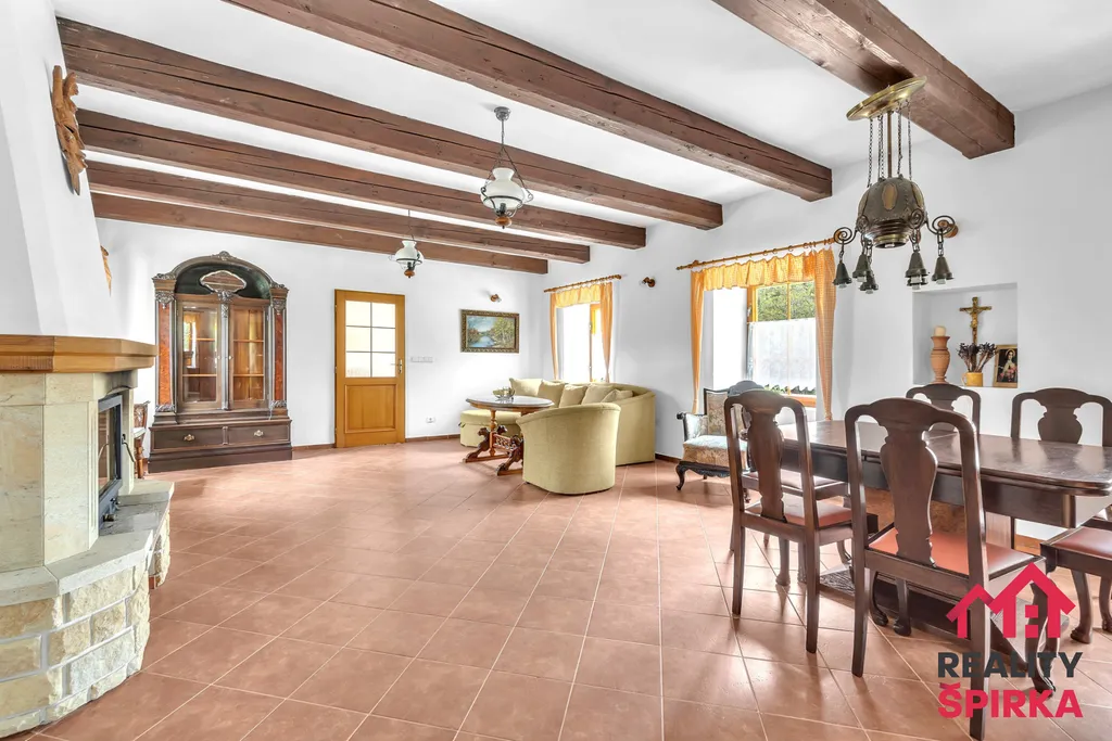 2+kk s velkorysou místností se stylovými krovy – kuchyň, jídelna a obývák v jednom, samostatný pokoj, krb s rozvody tepla, koupelna se sprchovým koutem, samostatné WC, chodba, spíž.