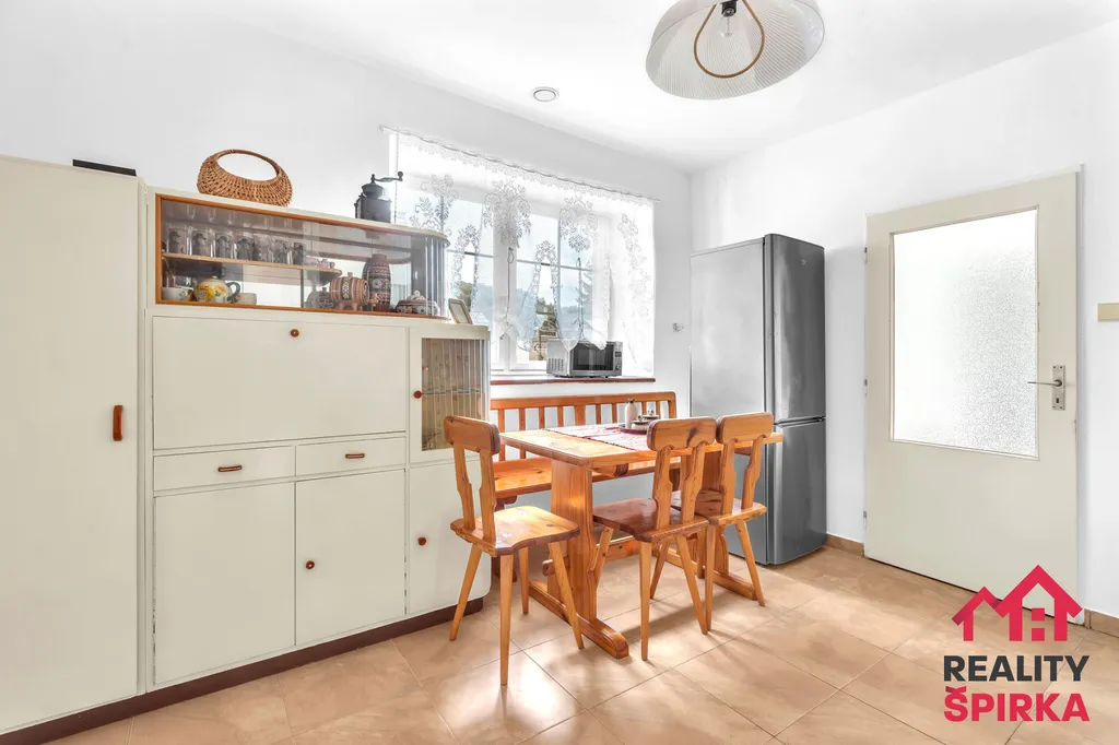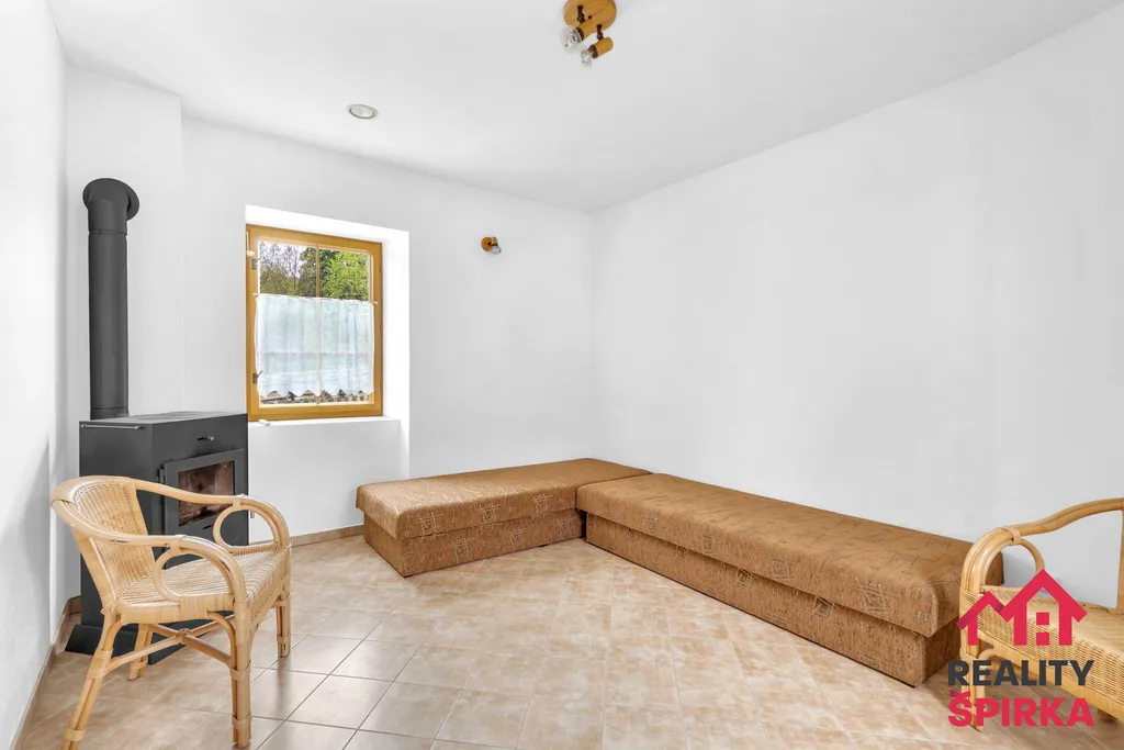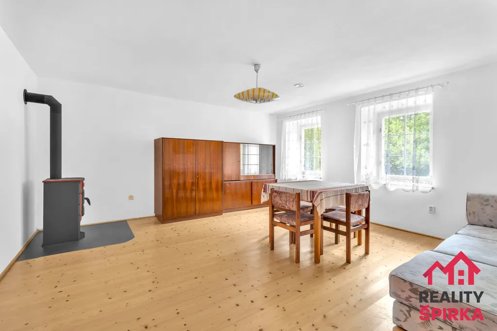 2+1 s útulnou kuchyní, kachlovými kamny, dvěma pokoji (jeden s krbovými kamny), novou koupelnou se sprchovým koutem, samostatným WC, spíží a malou relaxační místností s francouzským oknem a výhledem do zeleně uspořádaného dvorku.