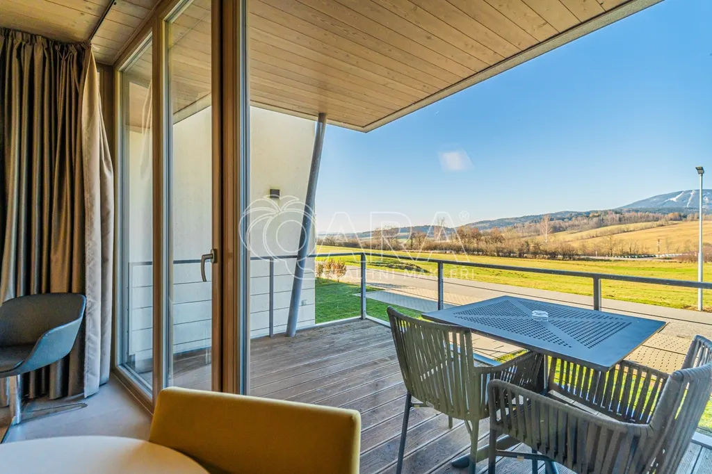 Nabízíme exkluzivní apartmán se zahradou a parkovacím místem v prestižním resortu s profesionální správou pronájmu. Golf, běžky, turistika, cyklistika přímo u domu.