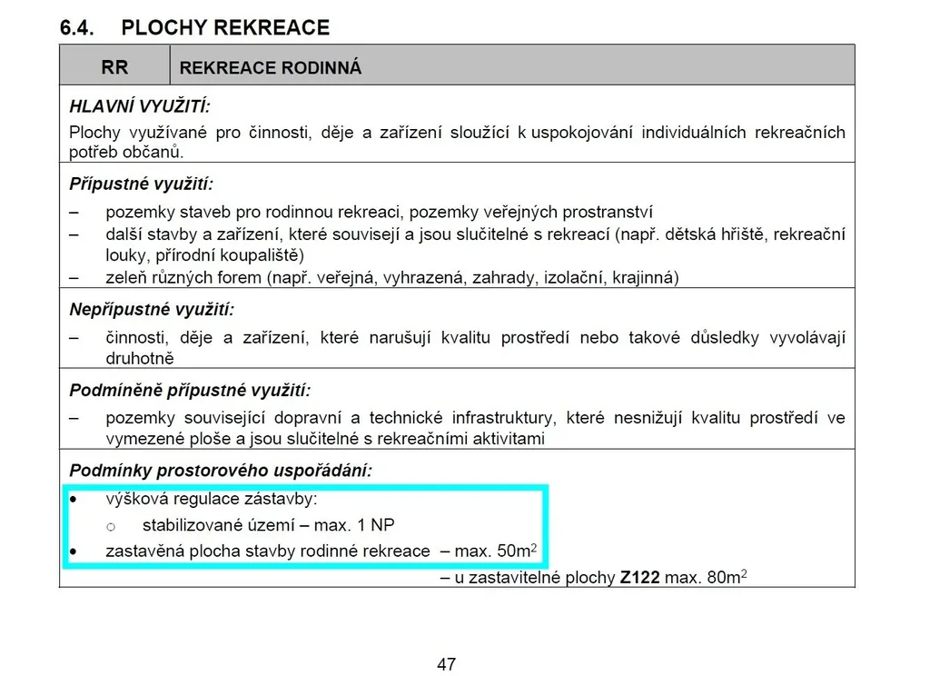 Dle územního plánu je zde možné postavit rekreační objekt o jednom podlaží do 50 m² s půdním prostorem. Stavět lze buď hned na místě stávající chatky, nebo je možné vyčkat cca 10 let na plánovanou rekonstrukci elektrického vedení. Při ní může EG.D zdarma nebo s minimálním doplatkem přeložit vedení mimo pozemek, což by umožnilo umístit stavbu na horní připravenou plochu vedle současného posezení, s ještě hezčím výhledem.