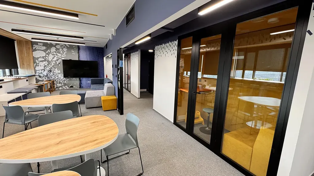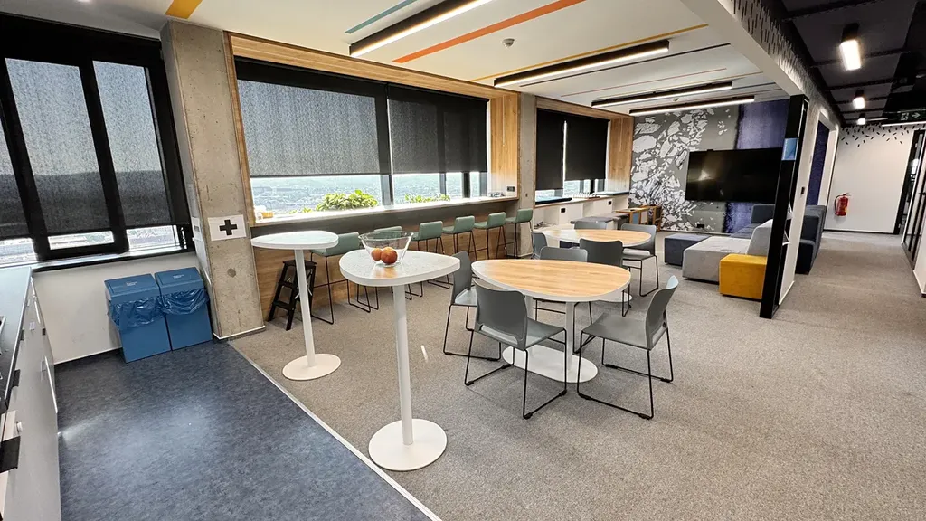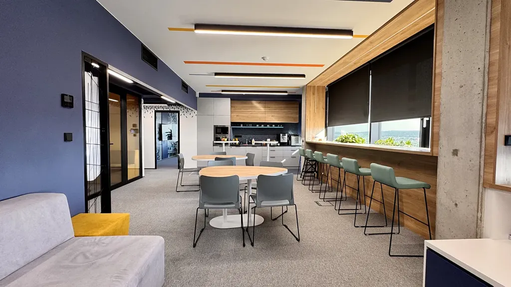 Nadčasově navržený interiér nabízí kombinaci open space kanceláří, samostatných pracovních místností, jednacích prostor, a nechybí ani „Meeting Point“ s kuchyňkou, sociální zařízení a sprchy.