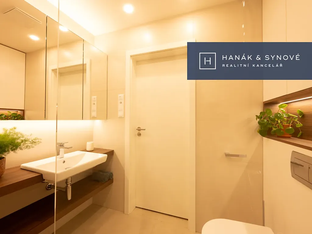 Byt je zařízený ve vysokém standardu a je nabízen částečně zařízený – kuchyňská linka se spotřebiči (varná deska, trouba, vestavěná lednice s mrazákem, pračka a sušička, myčka), vestavěná skříň, postel, venkovní žaluzie. Koupelna je vybavena walk-in sprchovým koutem se skleněnou zástěnou značky HÜPPE, záchodem a umyvadlem s umyvadlovou skříňkou, podsvíceným zrcadlem.