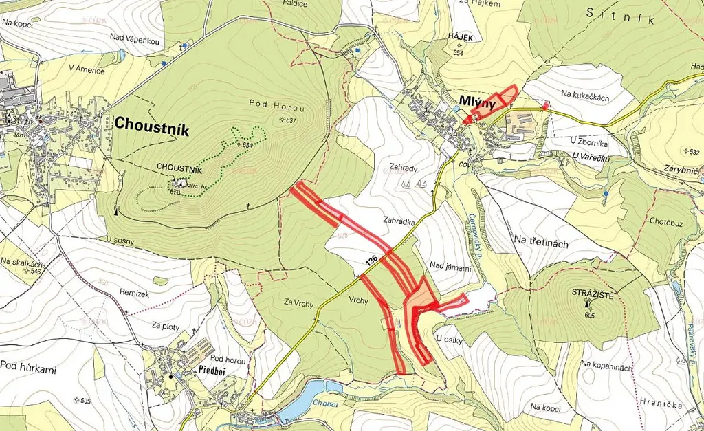 Předmětem prodeje je na parcelách č. 39/4, 39/5, 283/2, 284, 285, 290, 365/8, 367, 368, 382/3, 382/7, 382/10, 382/13, 384, 386, 413, 781/3, 820/4, 923, 933/4, 980/1 a 980/4 zapsaných na LV 169 v KÚ Mlýny u Choustníku.