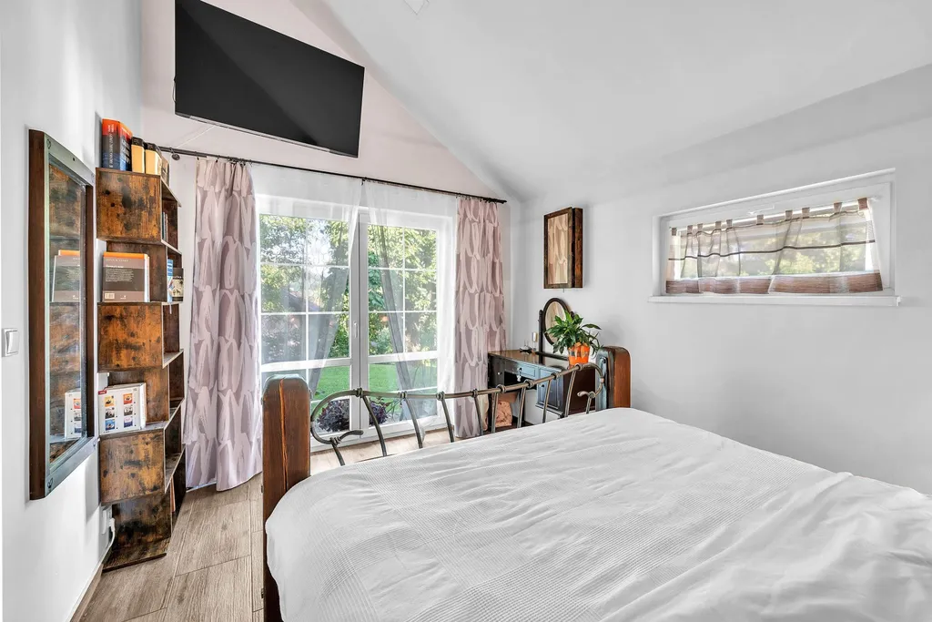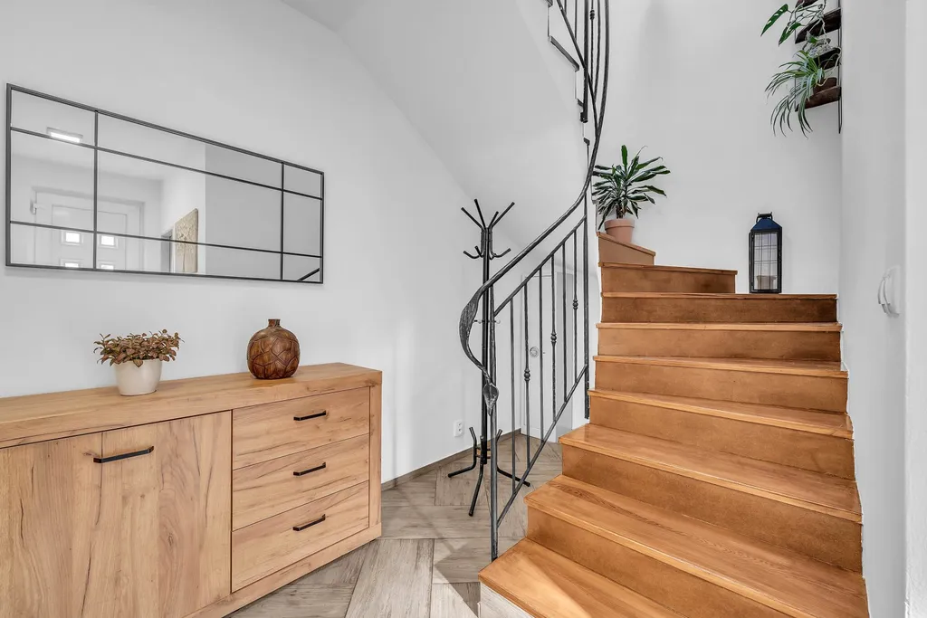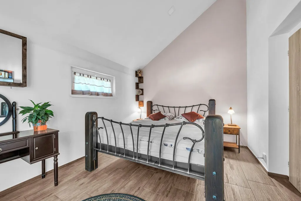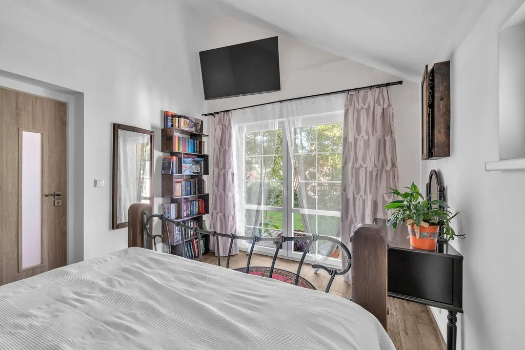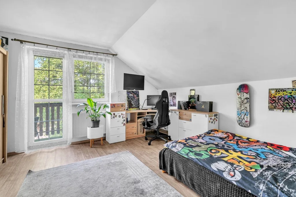 Druhá koupelna s vanou, sprchou a WC, dva dětské pokoje, jeden pokoj pro hosty a prostor na půdě. Dům má dva balkony – vhodné pro ranní kávu nebo večerní odpočinek.