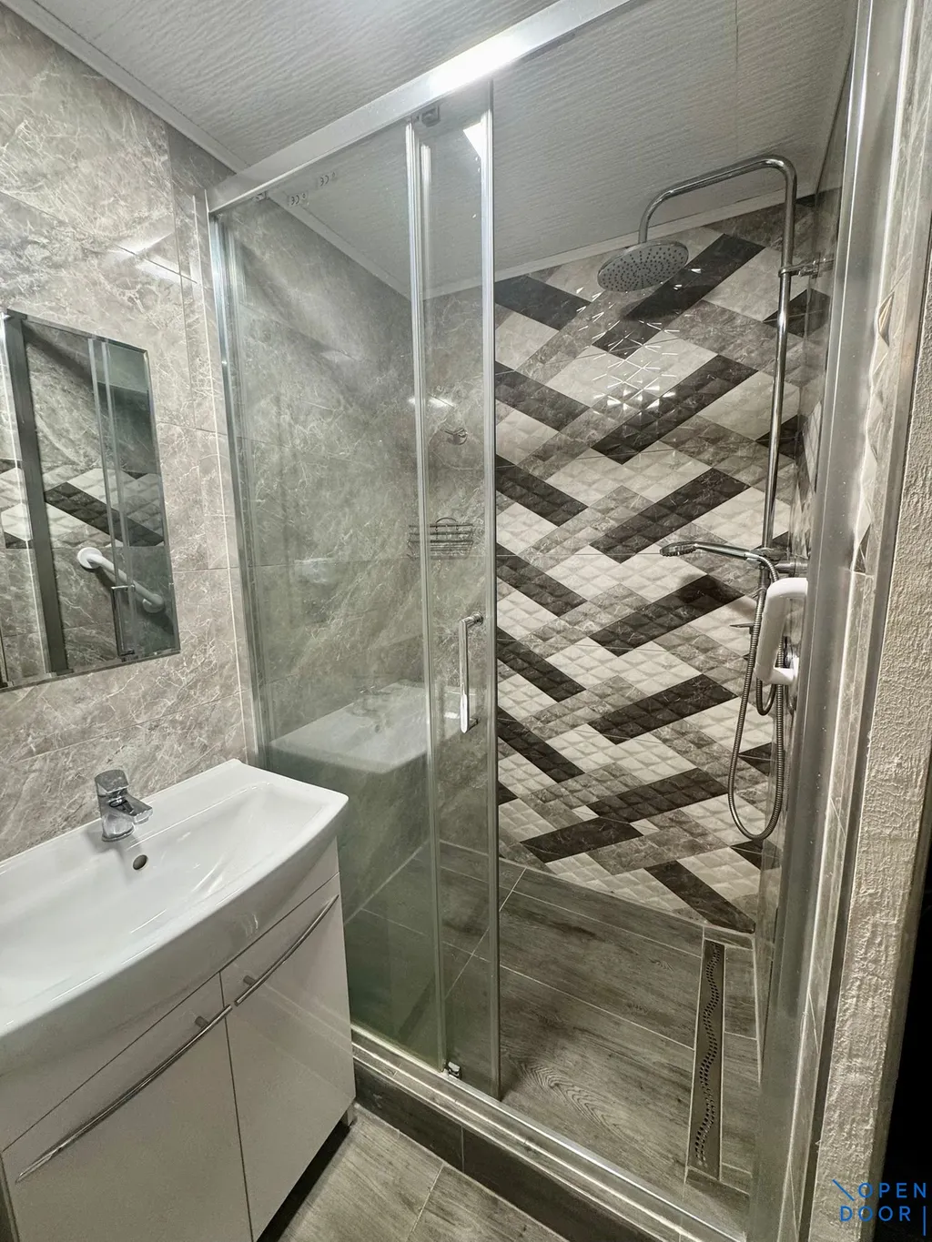-koupelnu se sprchovým koutem se zasklenými dveřmi, umyvadlem se skříňkou, zrcadlem a WC