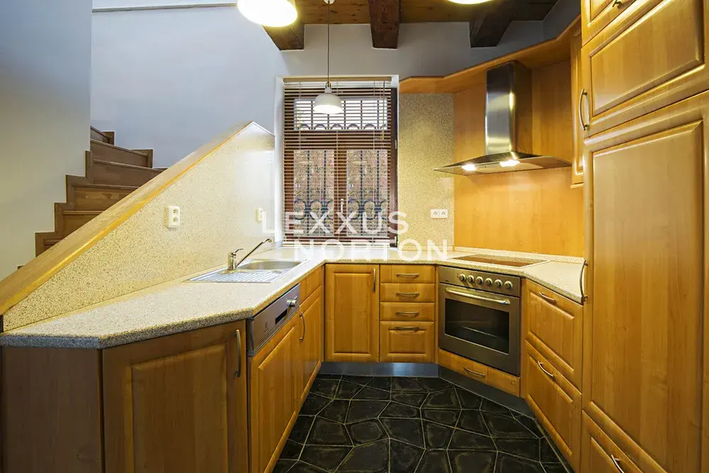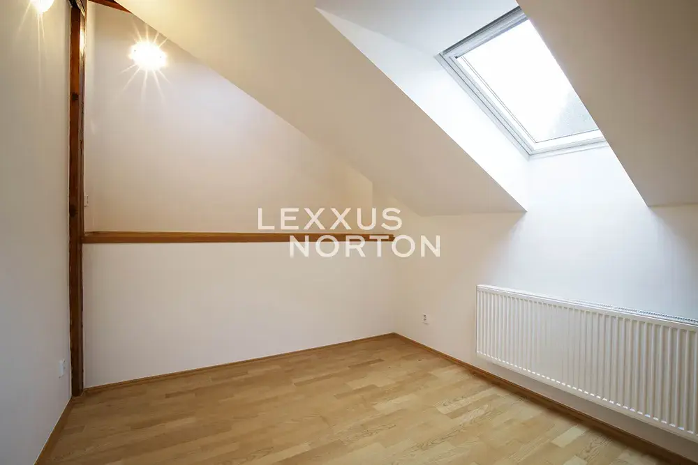 Tento nezařízený mezonet k pronájmu se sestává ze dvou pater. Přízemí dispozičně nabízí vstupní chodbu, prostorný obývací pokoj se vstupem na terasu a zahradu, dále je součástí této místnosti kuchyňský kout a jídelní prostor. Dále se na tomto patře nachází koupelna. První patro nabízí 3 samostatné ložnice, koupelnu, komoru a technickou místnost. V ceně nájmu je zahrnuto 1 parkovací místo v garáži.