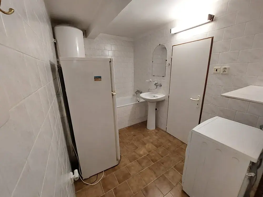 Nabízí se zařízený, je zde zánovní kuchyňská linka s kombinovaným sporákem, digestoř, lednice s mrazničkou, jídelní stůl a židle, pohovka, pračka, předsíň, šatna.