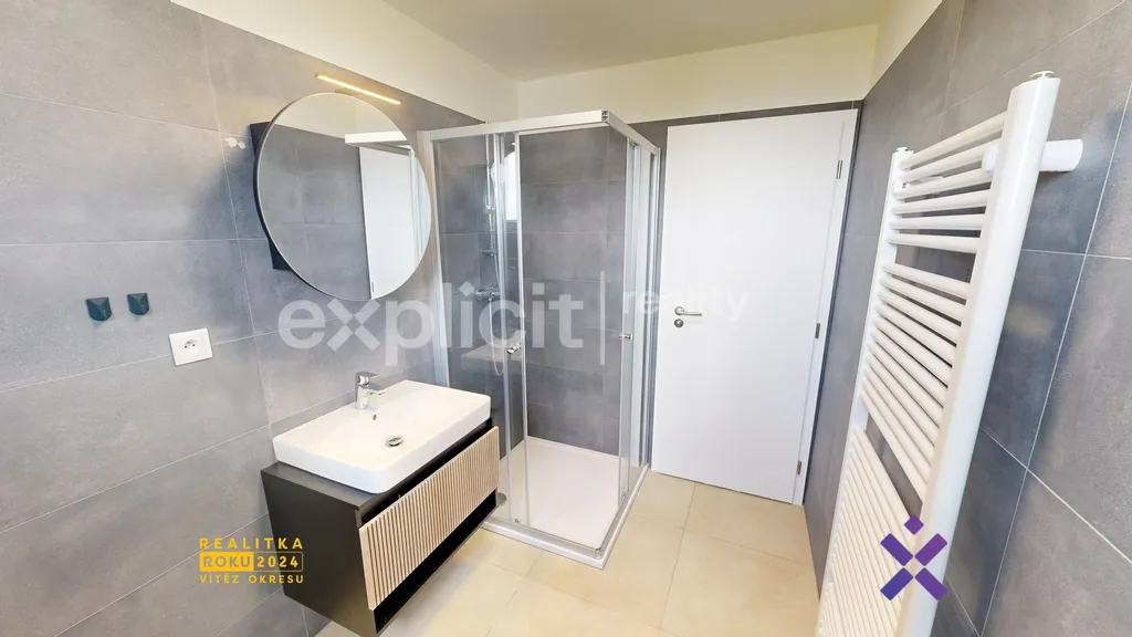 Koupelna se sprchovým koutem je společně s toaletou sloučena dohromady. V koupelně je topný žebřík.
