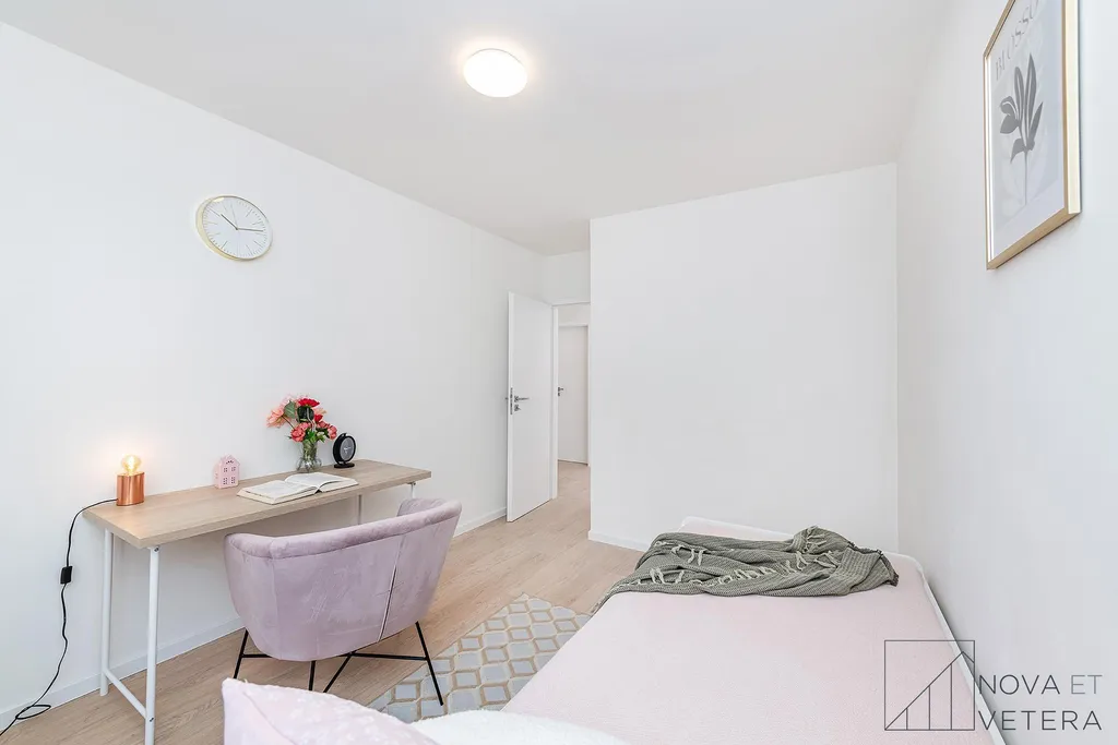 Dispozičně byt nabízí prostorný obývací pokoj s kuchyňským koutem a vstupem na lodžii o velikosti 5,5 m², tři samostatné pokoje vhodné jako ložnice, dětský pokoj či pracovna, moderní koupelnu se sprchovým koutem a samostatnou toaletu. Dostatek úložného prostoru zajišťuje prostorná vstupní chodba, k dispozici je rovněž samostatná místnost využitelná jako šatna či komora. K bytu náleží sklepní kóje o velikosti 2 m². Ke společnému užívání je dále k dispozici kolárna/kočárkárna v přízemí domu. K bytu je možné si pronajmout parkovací stání, což výrazně zvyšuje komfort bydlení v této lokalitě.