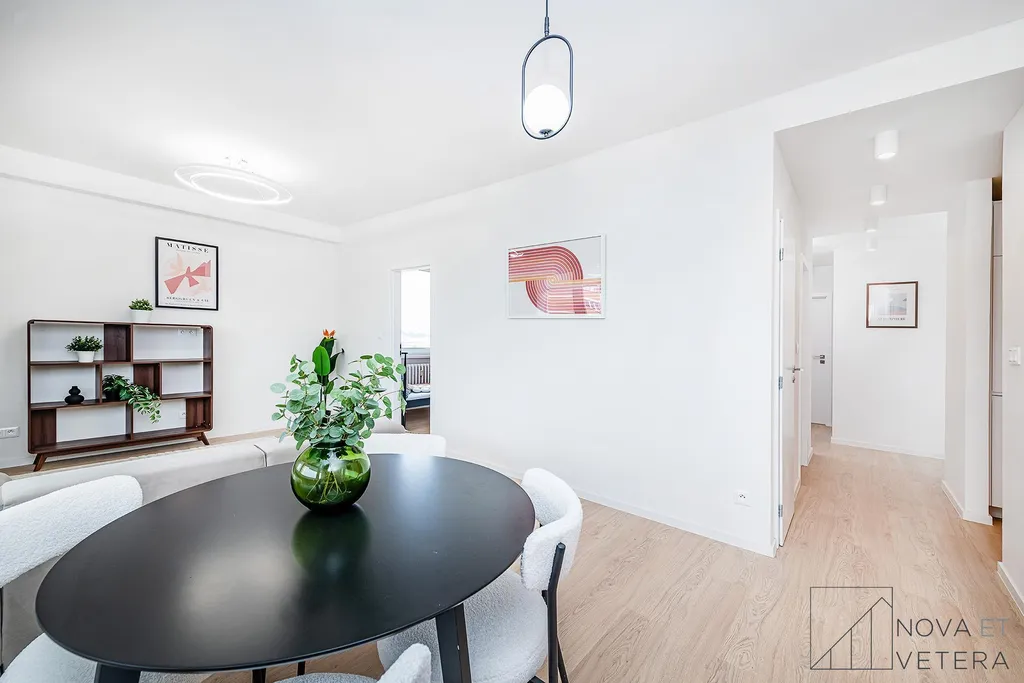 Jednotka je orientována na dvě světové strany - západ a sever. Světlý obývací pokoj disponuje vstupem na lodžii o velikosti 6 m² a s odděleným kuchyňským koutem. K dispozici jsou tři samostatné pokoje, které mohou sloužit jako ložnice, dětský pokoj, pracovna nebo pokoj pro hosty. Dva z pokojů mají vlastní vstup na lodžii, jedna o velikosti 3 m² a druhá 4,5 m². Moderní koupelna je vybavena sprchovým koutem a toaletou, druhá toaleta je samostatná. Vstupní chodba a samostatná místnost, která může sloužit jako komora nebo šatna nabízí dostatek úložného prostoru. K bytu náleží sklepní kóje o velikosti 2 m².