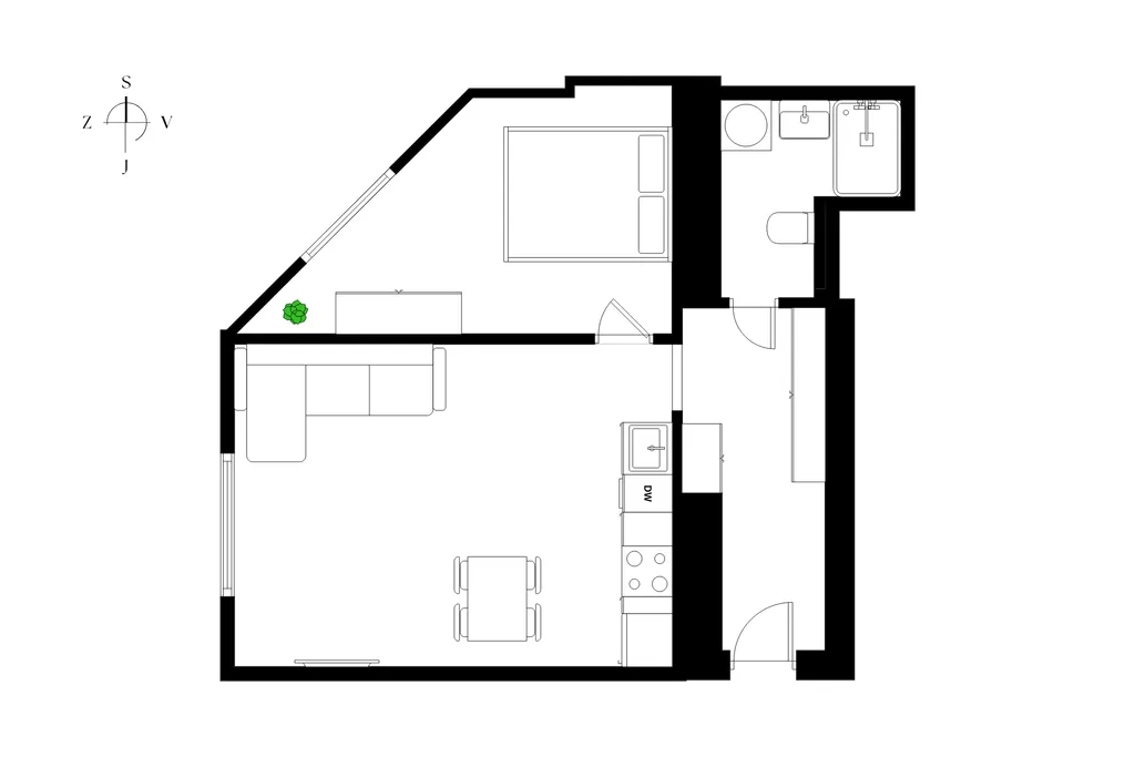 Dispozice nabízí prostorný a světlý obývací pokoj s kuchyňským koutem, samostatnou ložnici, moderní koupelnu s toaletou a prostornou předsíň s dostatkem úložného prostoru. K bytu dále náleží sklep o velikosti 2 m².