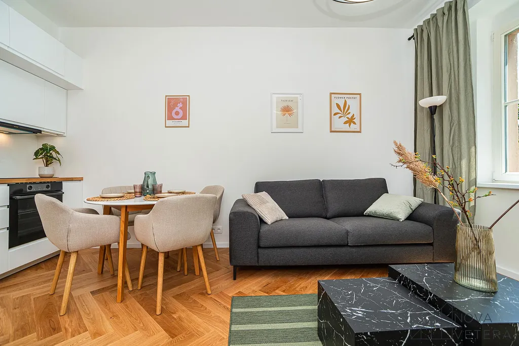 Interiér bytu právě prochází kompletní rekonstrukcí, která zahrnuje nové rozvody elektřiny, vody a odpadu, nové dřevěné podlahy, obklady a dlažby italské značky Marazzi, stejně jako koupelnu a toaletu se sanitou Grohe. Součástí vybavení je kuchyňská linka na míru se spotřebiči prémiové značky Bosch.