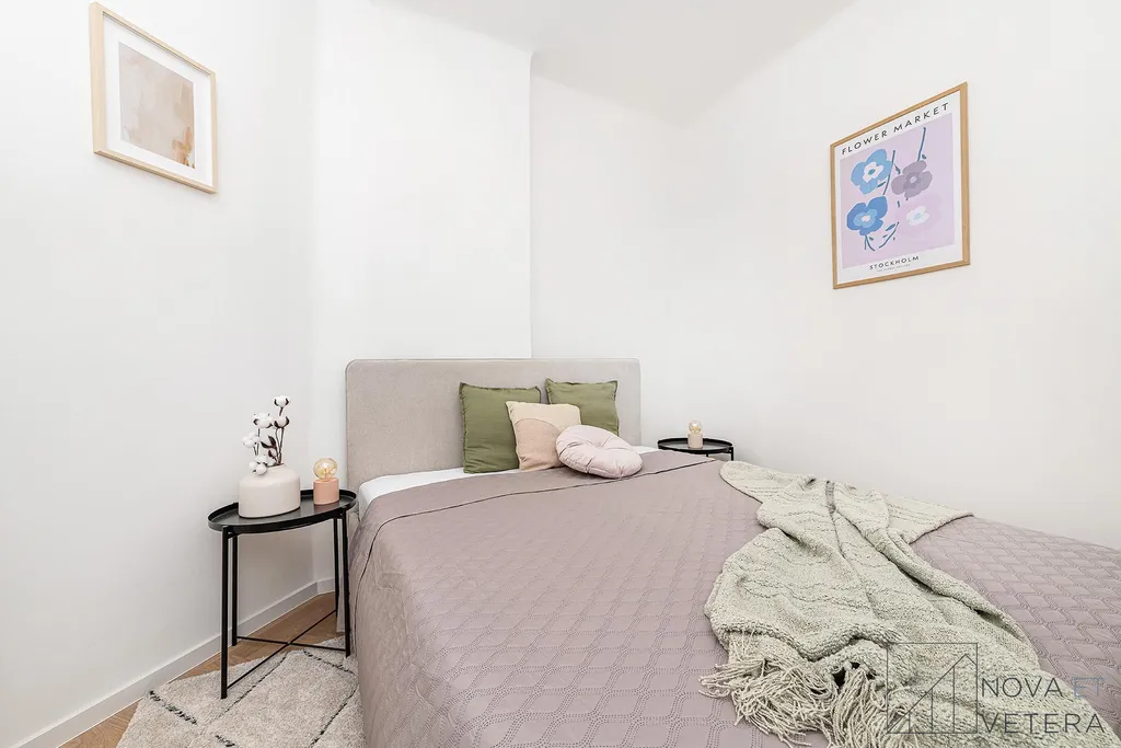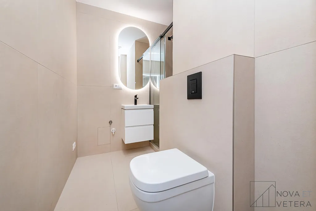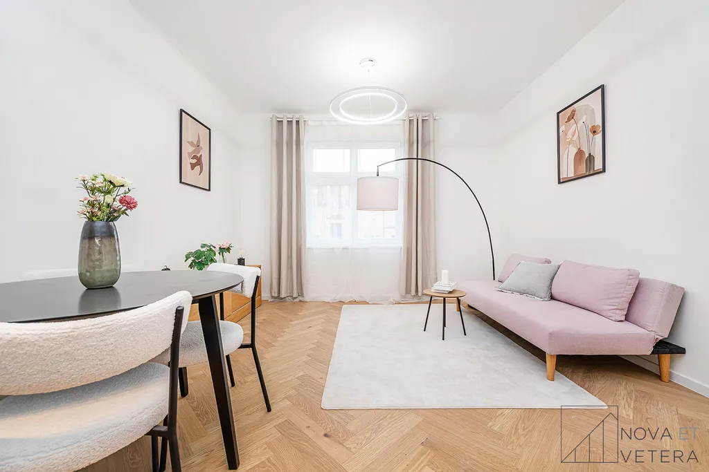 Interiér bytu právě prošel kompletní rekonstrukcí, která zahrnuje nové rozvody elektřiny, vody a odpadu, nové dřevěné podlahy, obklady a dlažby italské značky Marazzi, stejně jako koupelnu a toaletu se sanitou Grohe. Součástí vybavení je moderní kuchyňská linka se spotřebiči prémiové značky Bosch.