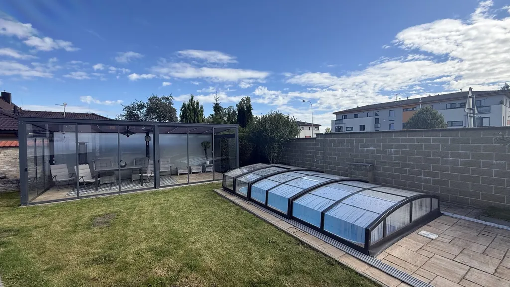 Na udržované zahradě je k dispozici kryté venkovní posezení, krb a dále samostatný domek s kuchyňkou a sprchou, který může sloužit jako zázemí pro návštěvy či relaxaci. Součástí zahrady je také krytý bazén, který zpříjemní letní období.