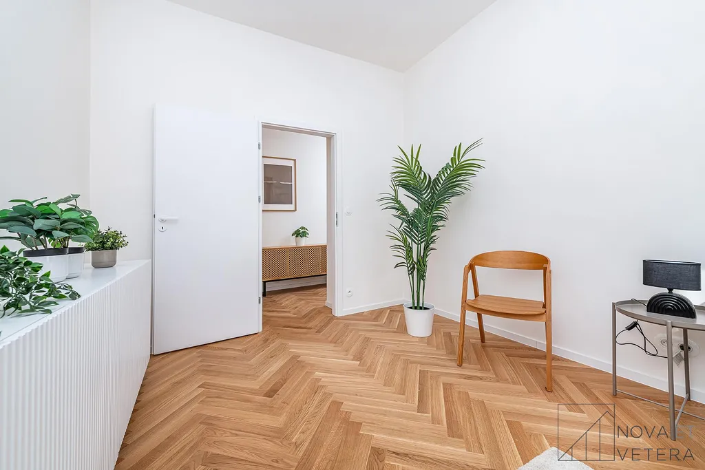 Vysoký standard kompletní rekonstrukce zahrnuje nové rozvody elektřiny, vody a odpadů. Dále rekonstrukce zahrnuje dřevěné parketové podlahy, kvalitní velkoformátové obklady a dlažbu od italského dodavatele MARAZZI. V koupelně a na toaletě naleznete sanitu značky GROHE. Moderní kuchyňská linka disponuje mimo jiné kvalitními spotřebiči značky BOSCH a zapuštěným granitovým dřezem.