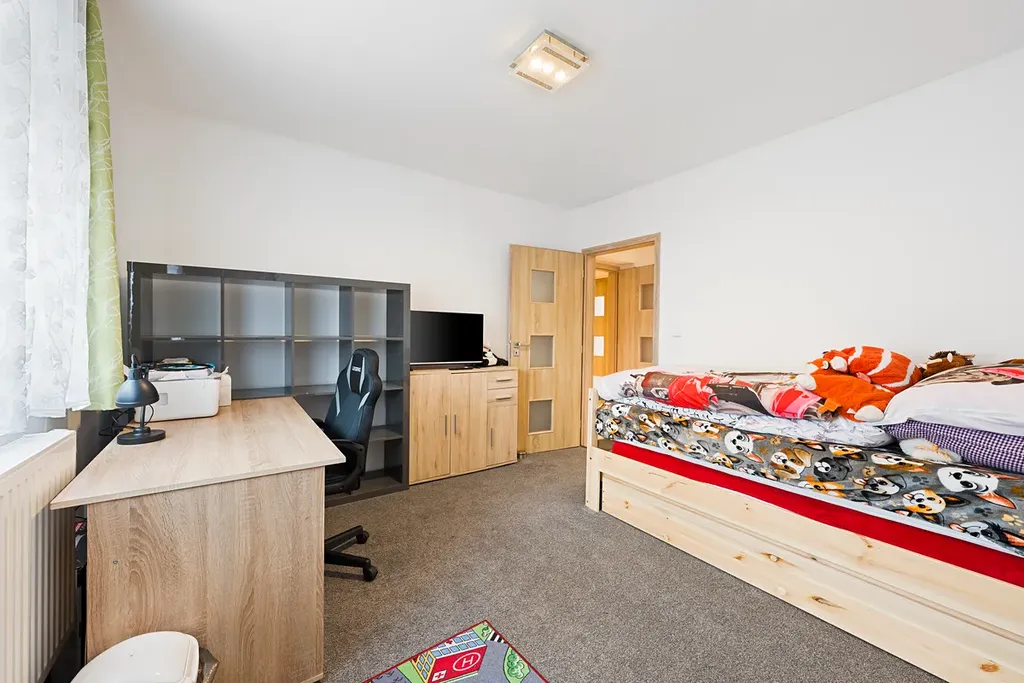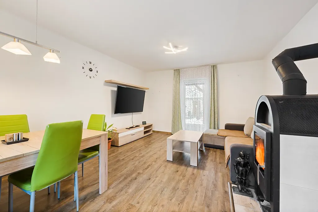 V přízemí domu se nachází kuchyně, obývací pokoj s krbovými kamny s výměníkem, která jsou napojena na výhřev domu, ložnice, dětský pokoj a druhý dětský pokoj, koupelna s vanou, umyvadlem a WC. Objekt napojen na obecní vodu, kanalizace, kde ve sklípku pod domem je studna, ze která je napojena na WC v domě a vodu na zalévaní zahrady. Celková plocha pozemku činí 610 m². Na pozemku parkování pro 2 auta.