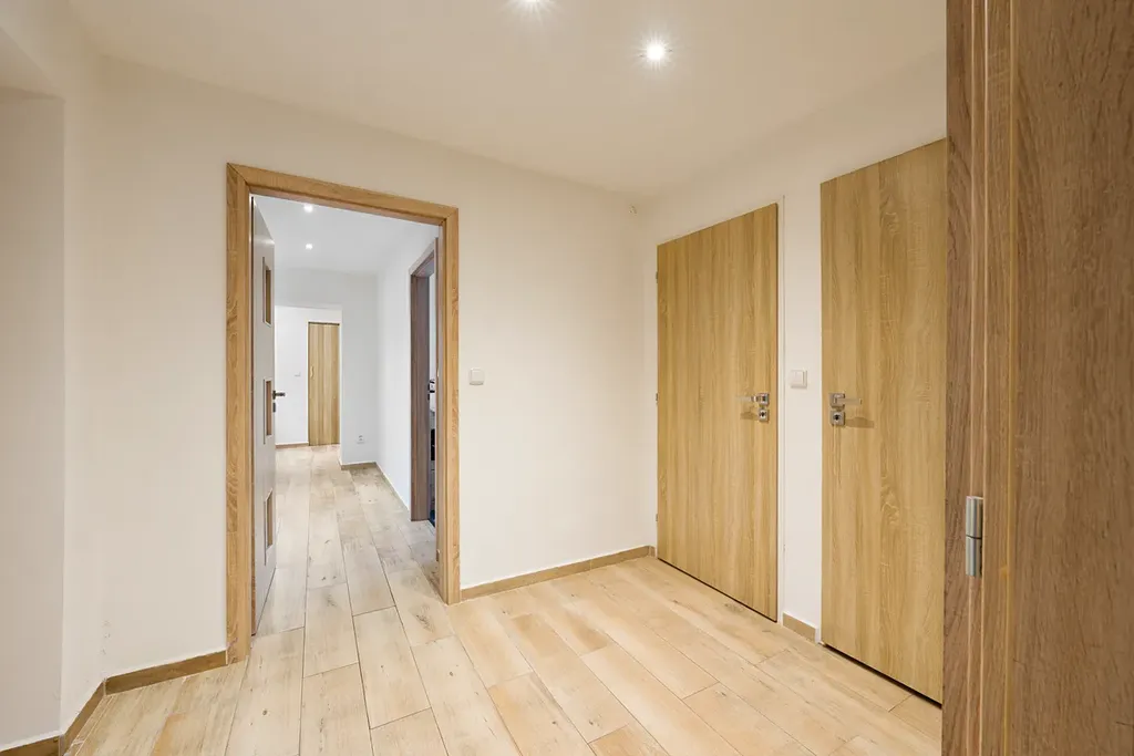 V interiéru nové podlahové krytiny, nová kuchyně, z předsíně jsou zděné schody do podkroví s půdou 100 m² s možností zobytnění, kde jsou nové krovy a věnec.
