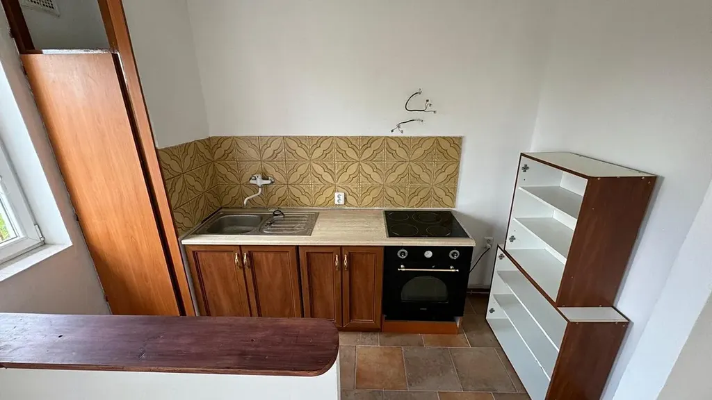 Obývací pokoj s kuchyňským koutem: Prostorný a světlý s výhledem do zeleně, připravený včetně nové kuchyňské linky se spotřebiči.