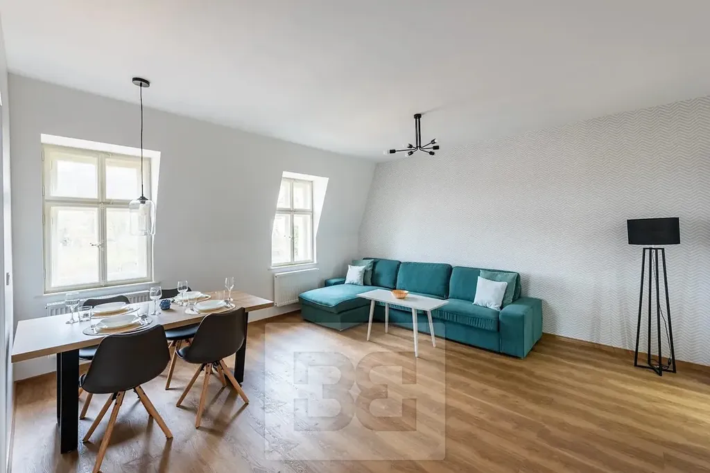 Byt je plně vybavený a uspokojí i náročného nájemníka. Nabízí moderní obývací část s pohovkou, pracovním stolem, televizí a jídelním stolem.