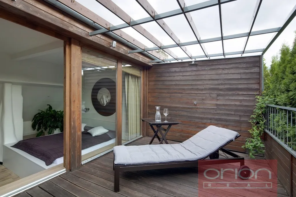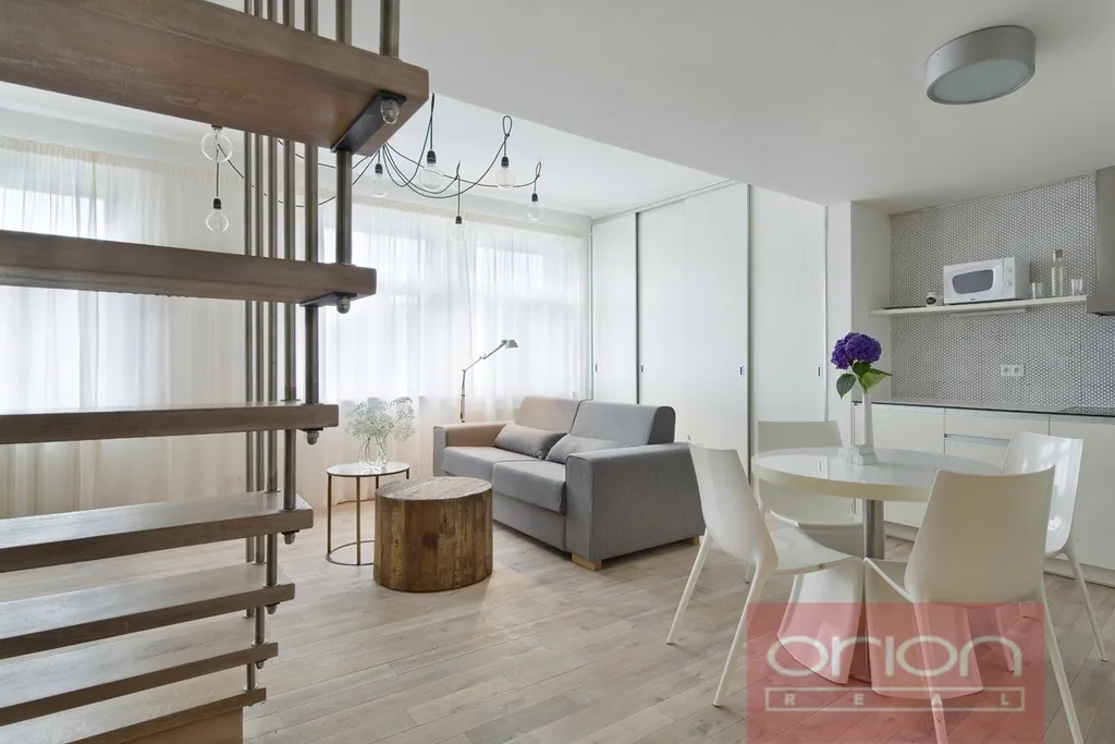 Nabízíme k pronájmu mezonetový byt 2+kk s terasou v 5. patře zrekonstruovaného secesního domu z 19. století v Praze 5. V domě je výtah. Zařízený byt o rozloze 53 m2 nabízí v horním patře ložnici s dvoulůžkem a vstupem na terasu. V dolním patře je obývací pokoj s rozkládací sofa spojený s kuchyňskou a jídelní částí s vybavenou kuchyňskou linkou, stolem a židlemi, koupelna se sprchovým koutem a samostatná toaleta. K vybavení apartmánu patří TV, SAT, WIFI a klimatizace.