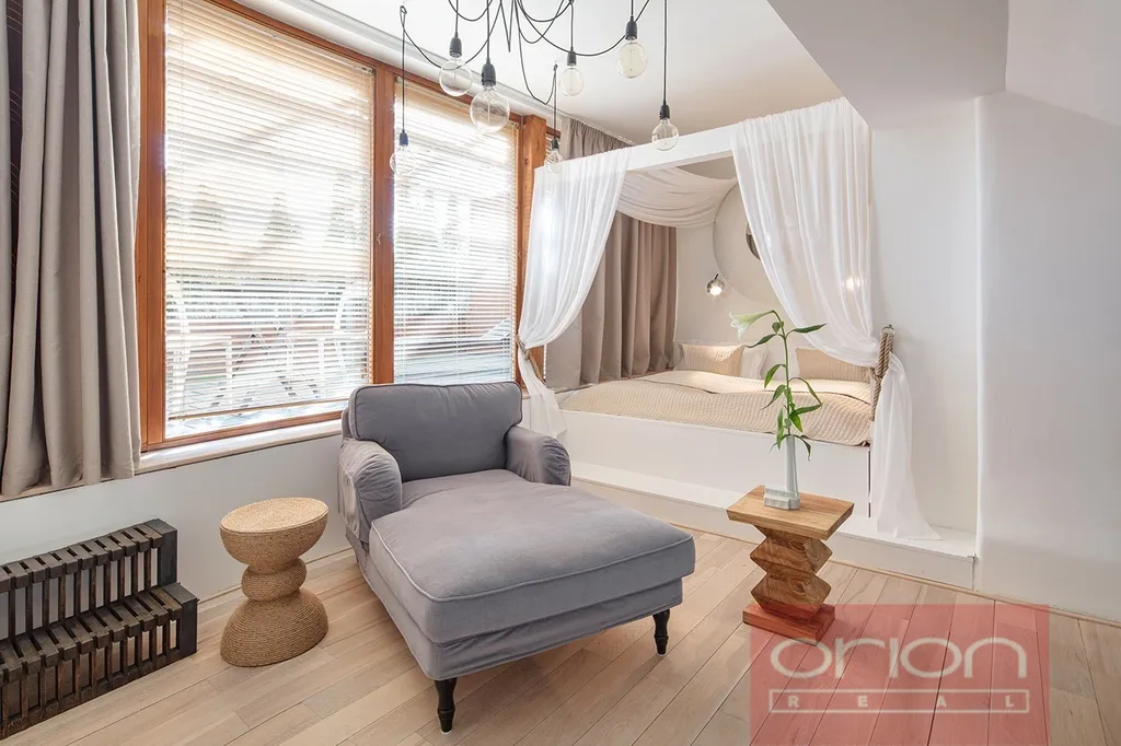 Nabízíme k pronájmu mezonetový byt 1+1 s terasou v 5. patře zrekonstruovaného secesního domu z 19. století v Praze 5. V domě je výtah. Zařízený byt o rozloze 38 m2 nabízí v horním patře ložnici s king size bed s nebesy a obývacím prostorem se sofa a vstupem na terasu. V dolním patře je kuchyňskáa jídelní část s vybavenou kuchyňskou linkou, stolem a židlemi, koupelna a WC, v předsíni je šatní skříň. K vybavení apartmánu patří TV, SAT, WIFI a klimatizace.