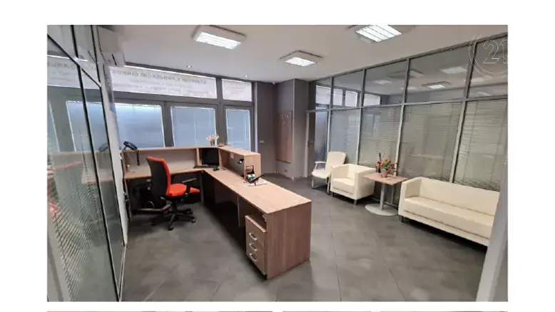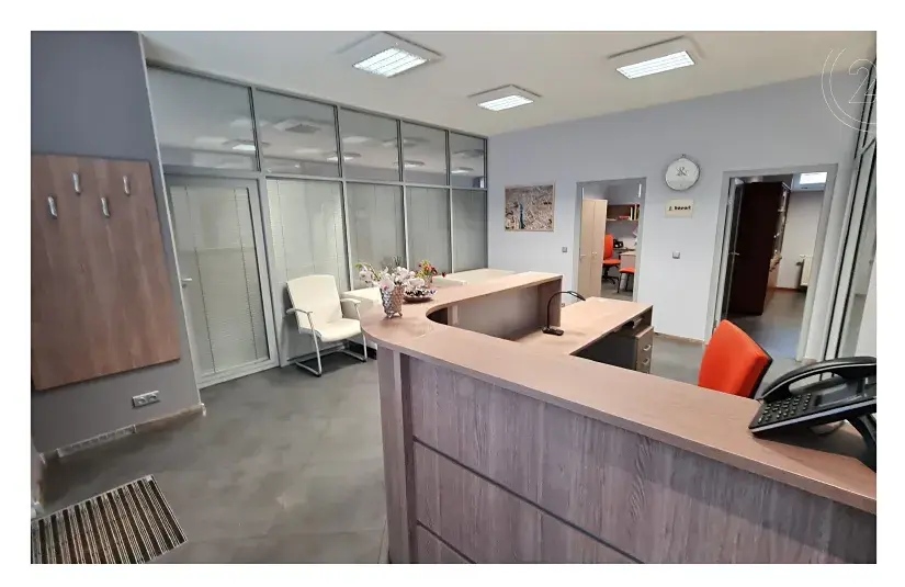 Prostor je přizpůsoben potřebám podnikání s recepcí, zasedací místností, sdílenou kanceláří pro 5 osob a samostatnou kanceláří.