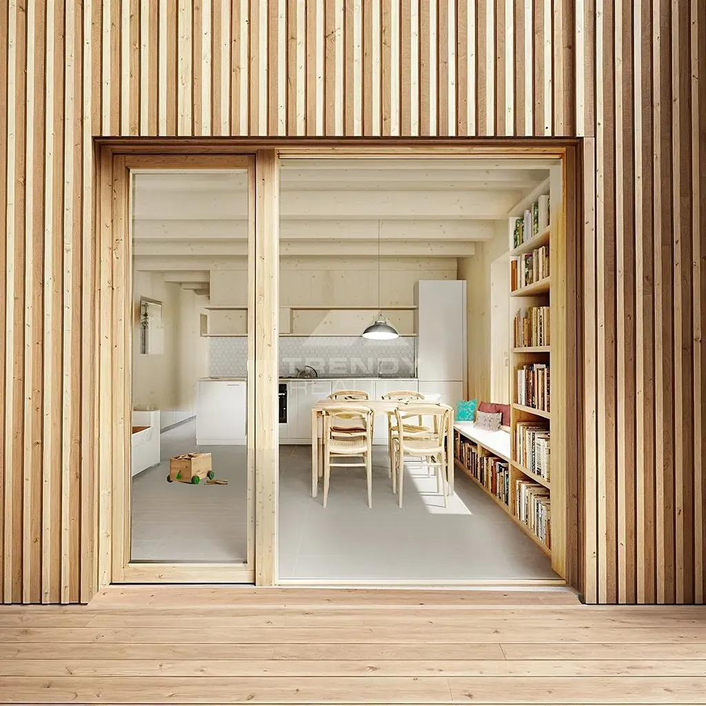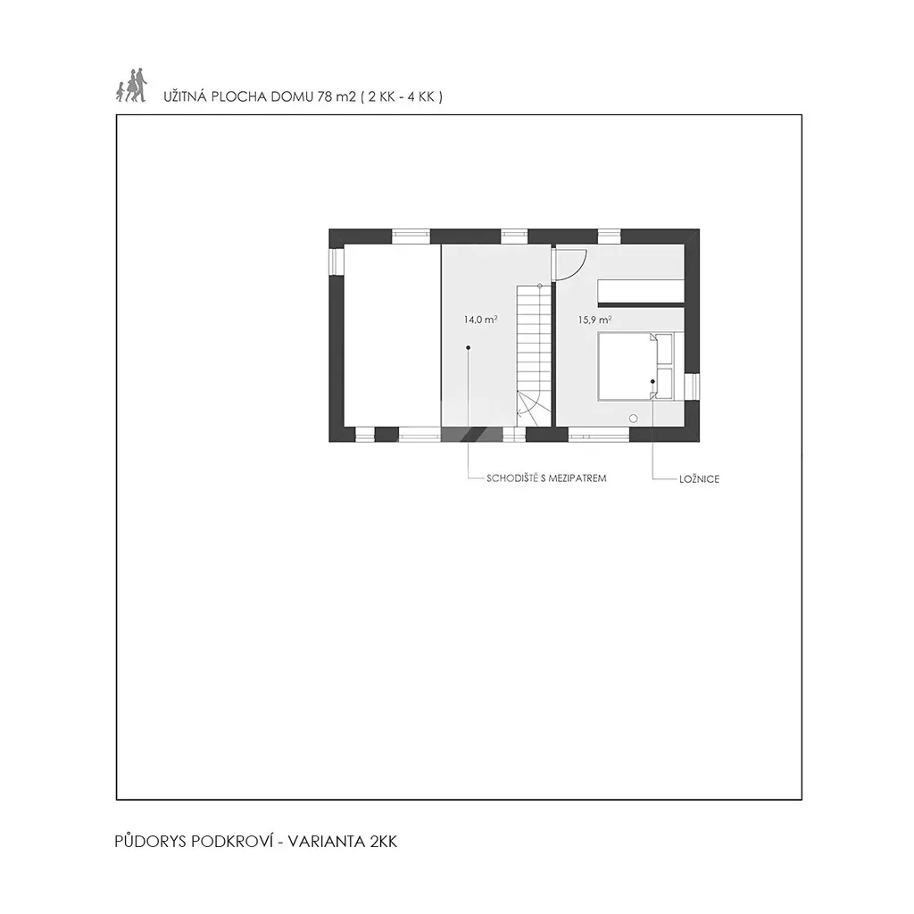 Kompaktní dům pro celý život: přízemí s obytným prostorem a kuchyní (36 m²). Patro s mezipatrem umožňuje variabilitu – začíná jako 2+KK pro mladý pár, lze upravit na 3+KK pro rodinu s dětmi nebo 4+KK s dvěma ložnicemi po 11 m². Po odchodu dětí se vrací k původní otevřené dispozici. Moderní dřevěný design s krytou terasou. Nízkoenergetická konstrukce domu s podlahovým topením zajišťuje nízké provozní náklady na vytápění a maximální komfort.