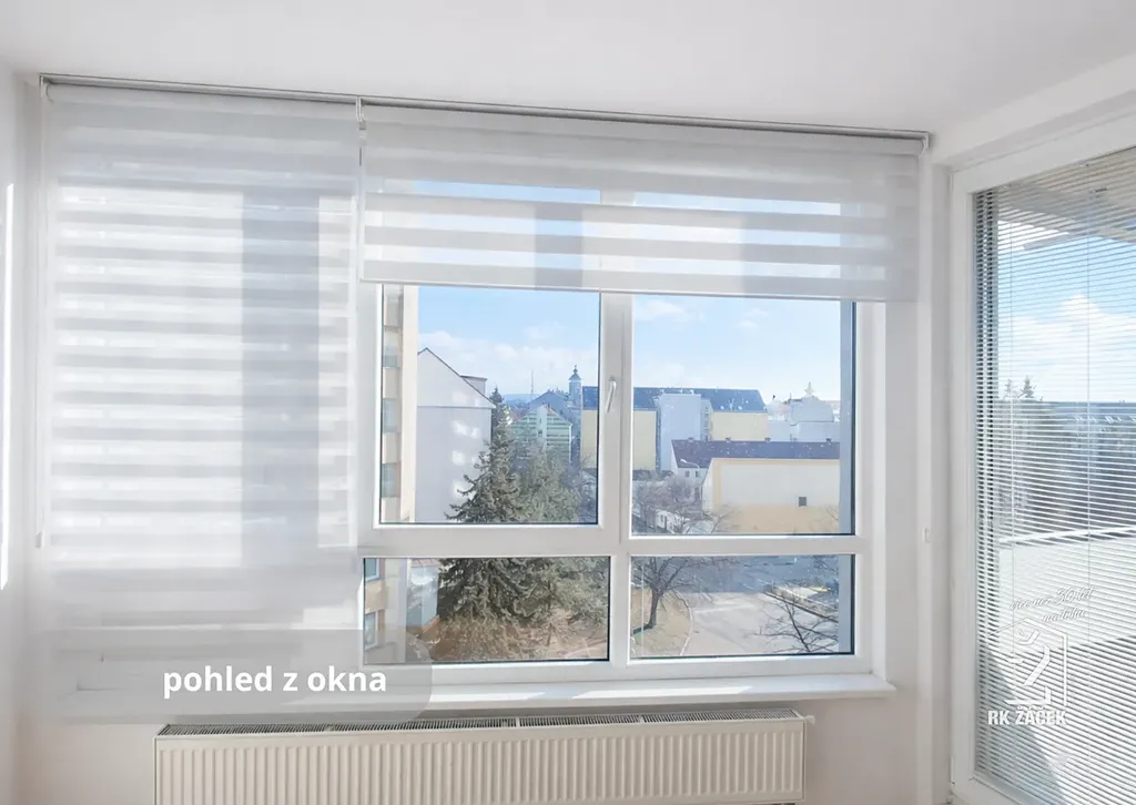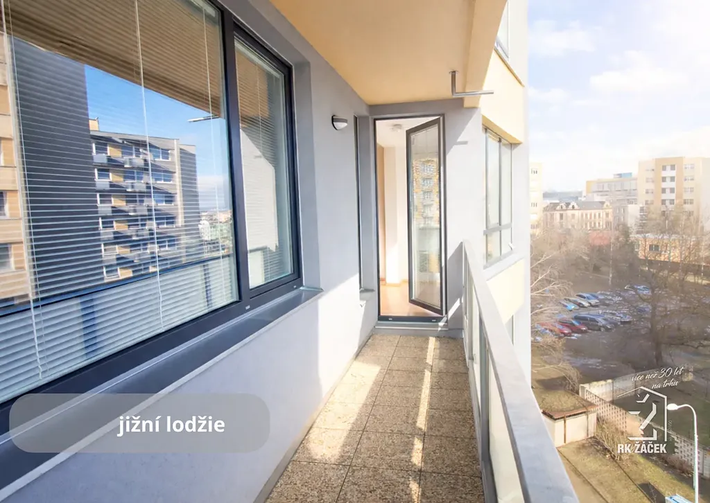 Interiér bytu působí vzdušně a velmi příjemně už při vstupu. Dominantou je prostorný obývací pokoj s kuchyňským koutem o velikosti 32,7 m², kde je dostatek místa jak pro plnohodnotnou kuchyni, tak pro jídelní stůl i pohodlnou sedací soupravu. Díky velkým proskleným plochám je byt krásně světlý po celý den. Z obývací části je vstup na dvě lodžie, které výrazně rozšiřují obytný prostor – východní lodžie o ploše 7,71 m2 je ideálním místem pro klidná rána s kávou, jižní lodžie o ploše 6 m2 nabízí jedinečný výhled na Černou věž a panorama centra města, který se jen tak neokouká.