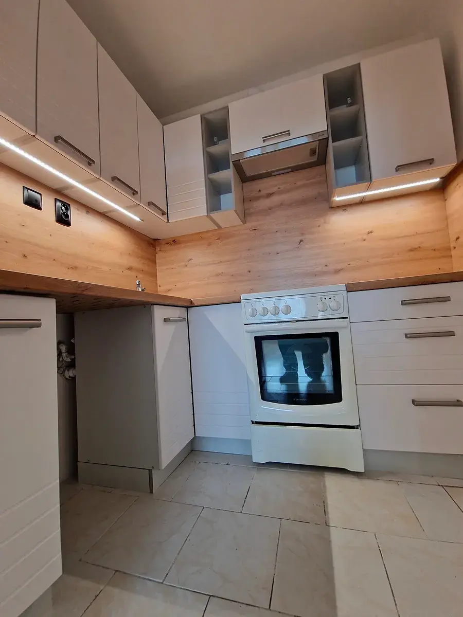 V kuchyni umístěna lednice s malým mrazákem. Dále v kuchyni umístěn elektrický sporák s elektrickou troubou.
