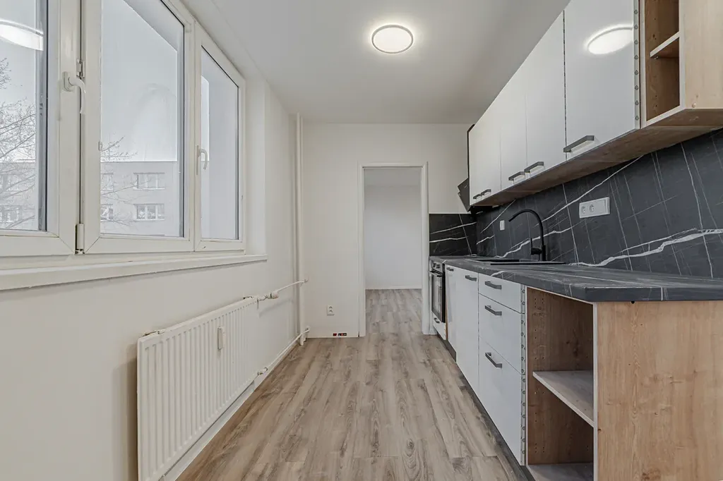 Nová kuchyňská linka s novými vestavěnými spotřebiči v záruce značky Mora, včetně vestavěné myčky a elektrické indukční varné desky. Koupelna má nově vybudované jádro a disponuje vanou a umyvadlem, závěsná toaleta oddělena.