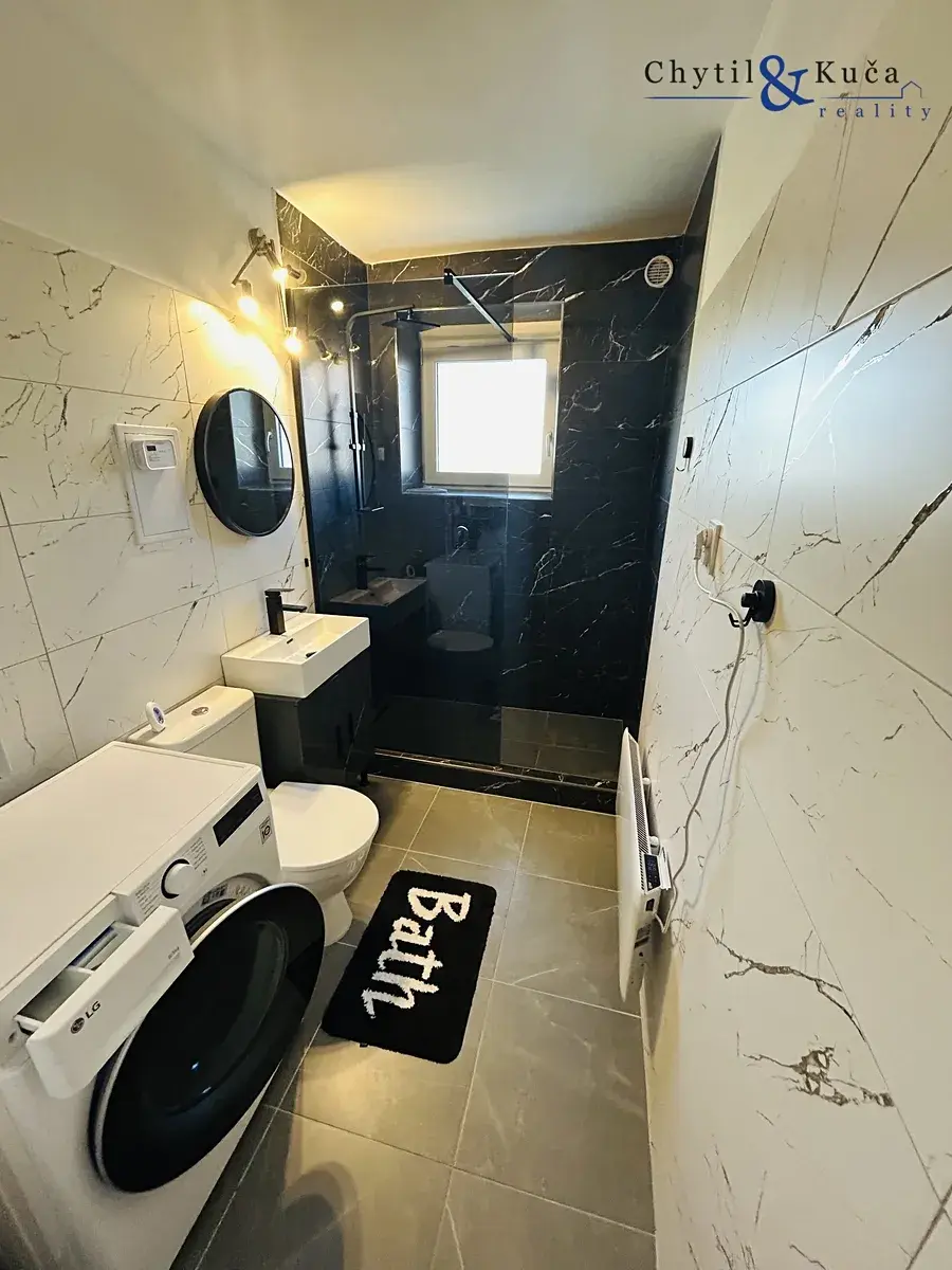 Byt je dispozičně řešený jako 2+kk (chodba, koupelna s wc a sprchovým koutem, 2 místnosti vč. kuchyňské linky) a je po kompletní rekonstrukci.