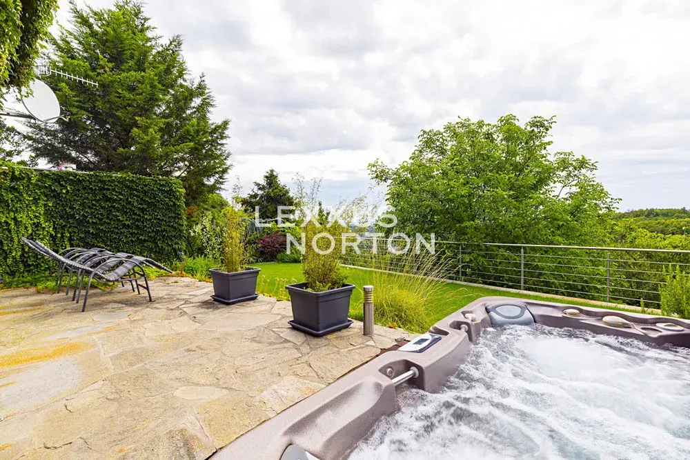 Součástí domu je plně vybavený kuchyňský kout se sporákem, troubou, lednicí, mrazákem, myčkou nádobí a mikrovlnnou troubou. K dispozici jsou dvě koupelny - jedna s vanou a toaletou a druhá se saunou a sprchovým koutem. Vybavení dále zahrnuje vestavěné skříně a pračku. K domu náleží garáž, parkovací stání na pozemku, zahrada s krásným výhledem do údolí a terasa s venkovním posezením, vířivkou a venkovní sprchou.