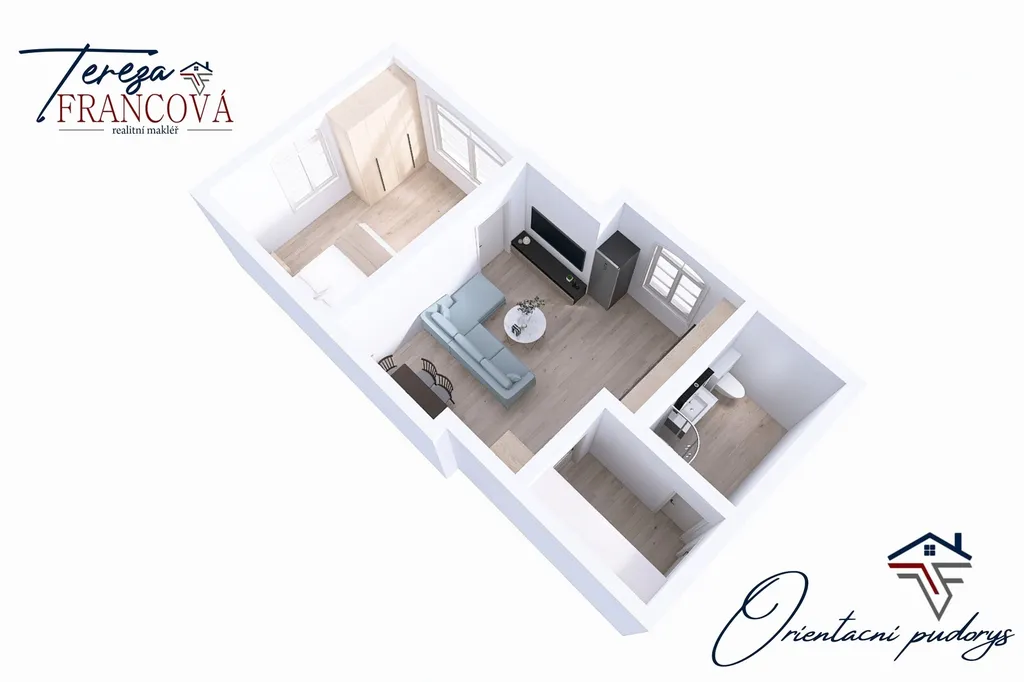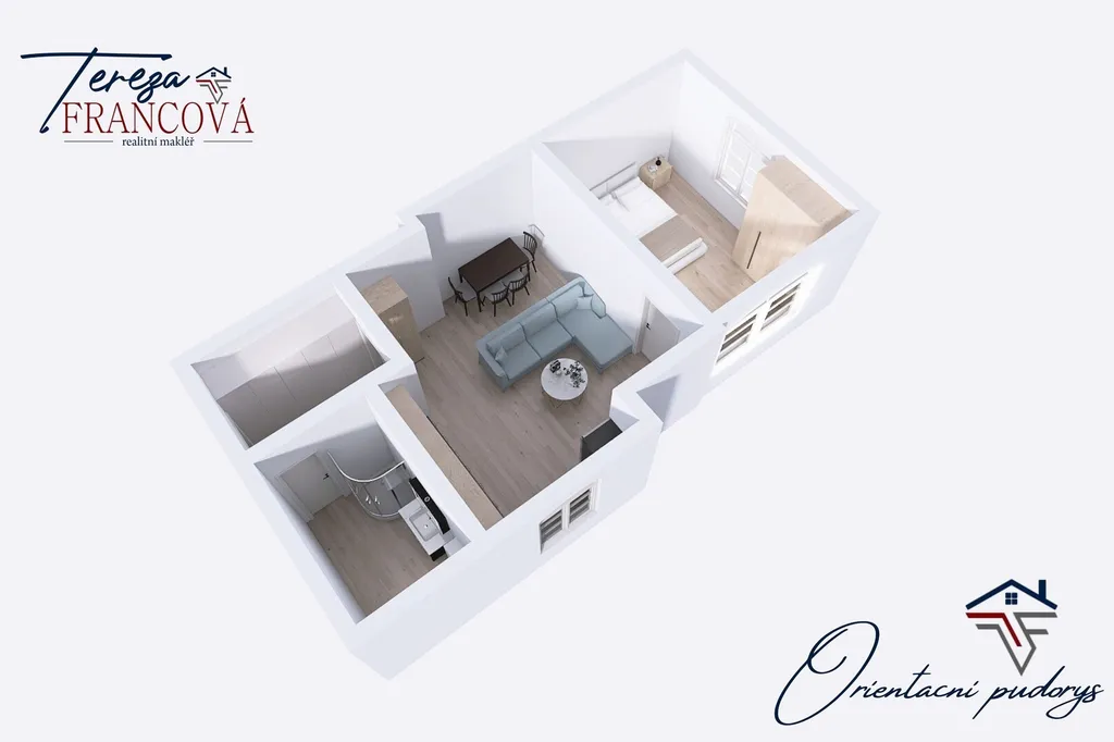 Součástí pronájmu není pohovka, jídelní stůl se židlemi, lednice ani postel, tento nábytek bude z bytu odvezen.