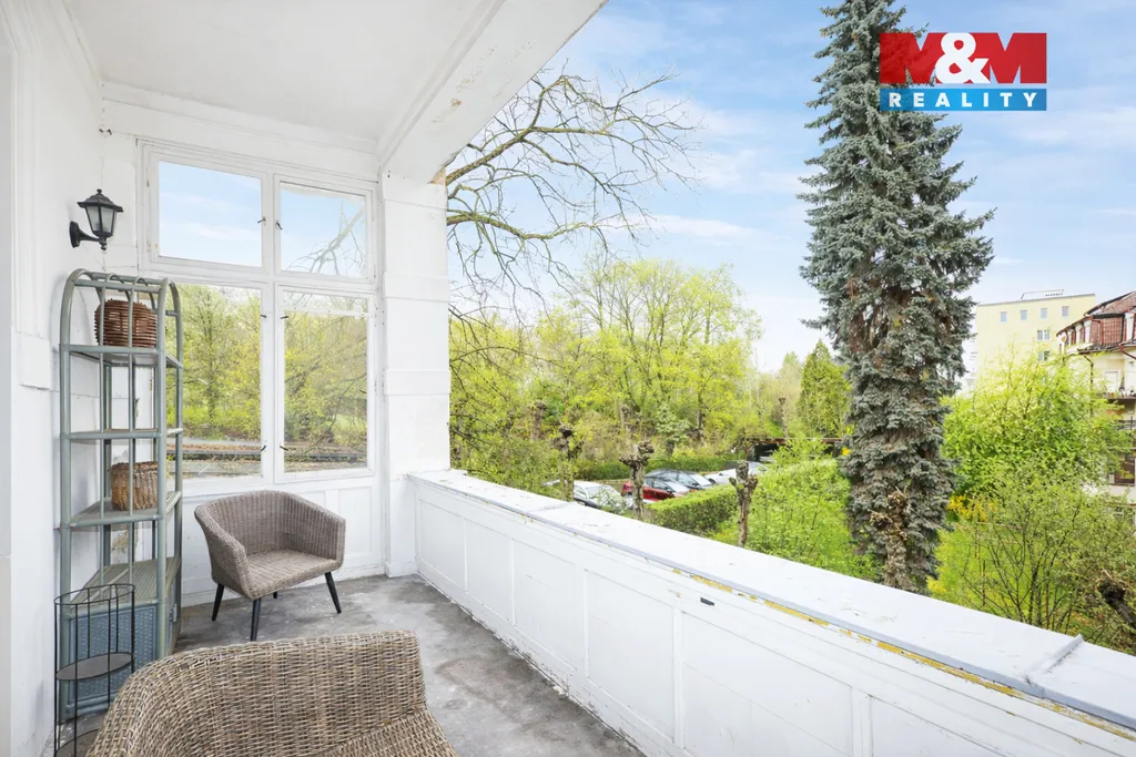 Součástí bytu jsou tři menší balkóny, jedna prostorná terasa a velký sklep, což je v této lokalitě velmi nadstandardní. Vytápění i ohřev teplé vody zajišťuje vlastní plynový kotel. Dům je ze všech stran obklopen zelení a zahradou, přesto se nachází jen 200 metrů od kolonády. V bezprostředním okolí je kompletní občanská vybavenost – obchody, restaurace, lázeňské domy i MHD.