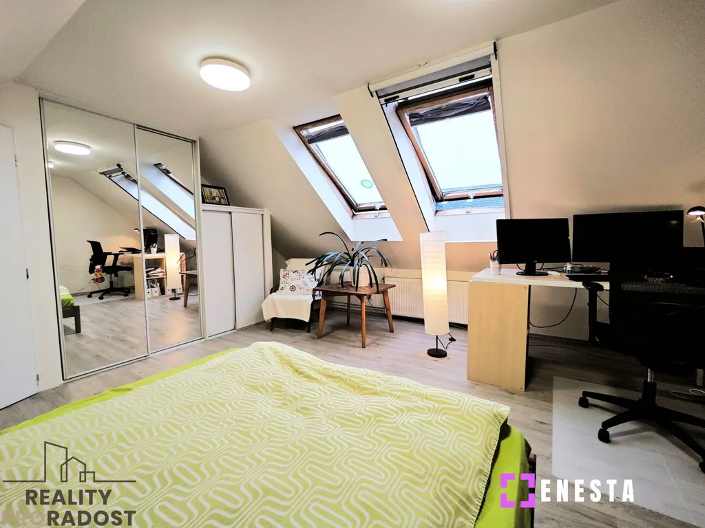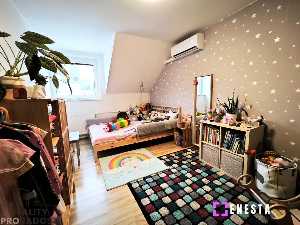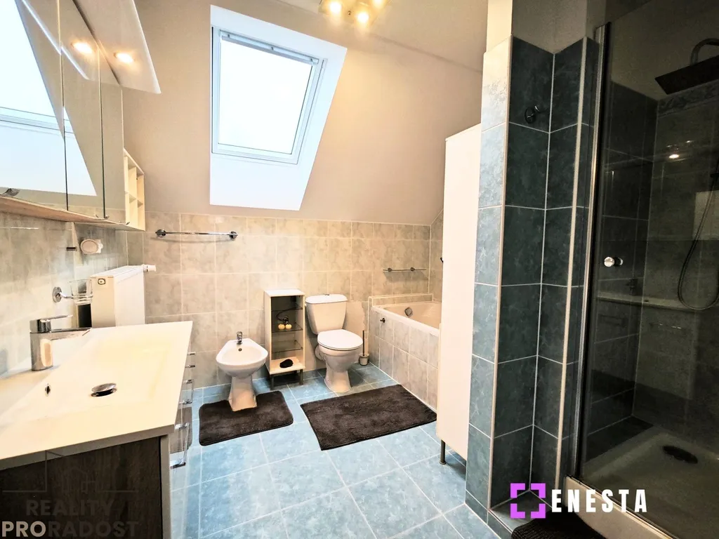 Klidová zóna se nachází v prvním patře, kde najdete hlavní ložnici s velkou vestavěnou skříní, dětský pokoj s klimatizací a menší pokoj, který skvěle poslouží pro hosty nebo jako pracovna. Chodba je chytře využita pro další vestavěnou skříň, která plní funkci šatny. Komfortní zázemí poskytuje velká koupelna vybavená vanou, sprchovým koutem, toaletou i bidetem. Pokud by vám tento prostor nestačil, v podkroví na vás čeká další velkorysá místnost o ploše 25 m², která v současnosti slouží jako kombinace ložnice a pracovny, ale její využití záleží jen na vašich potřebách.