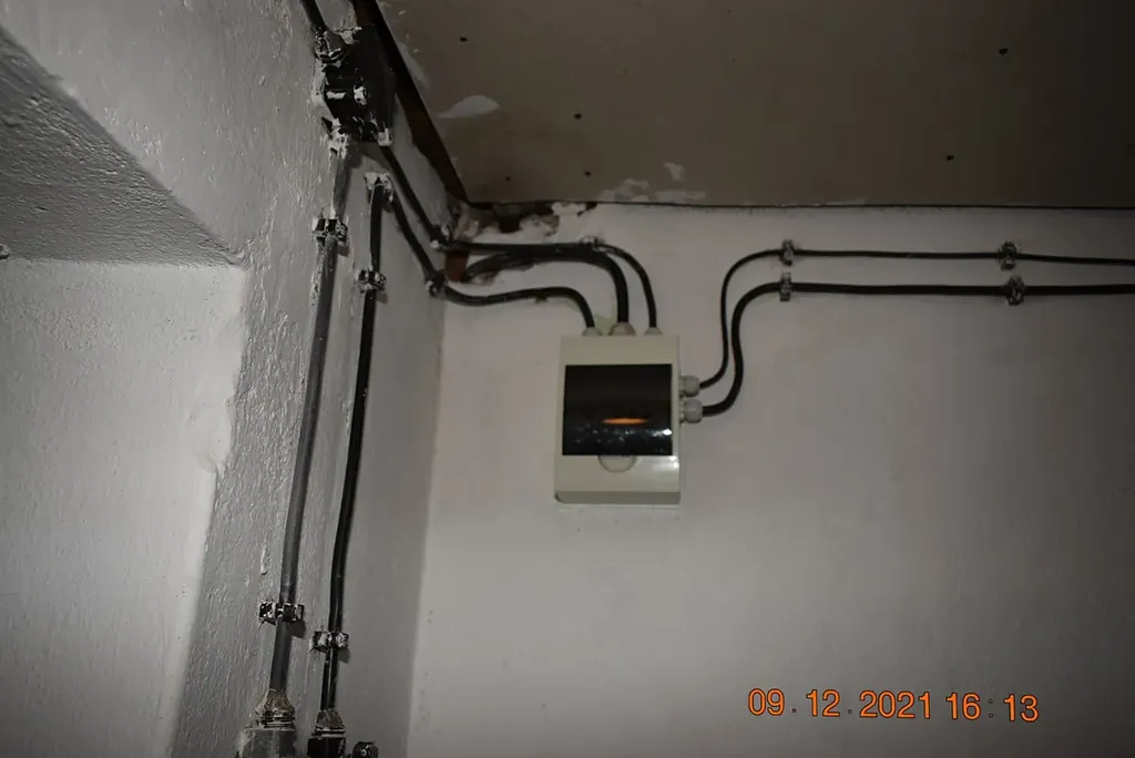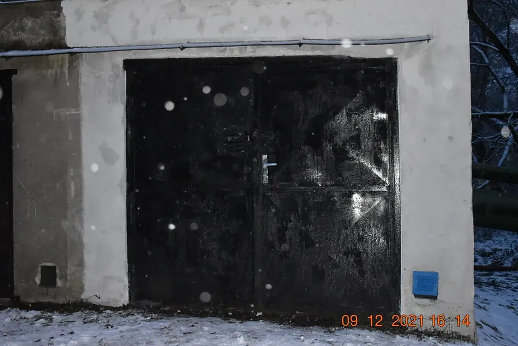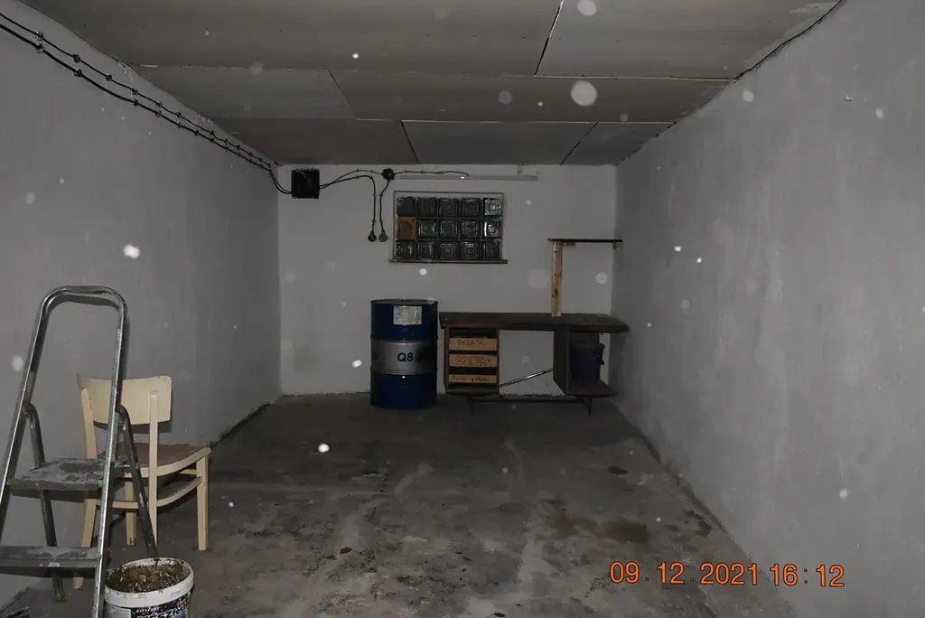 Garáž je prázdná, má dvoukřídlá plechová vrata a el.energii.