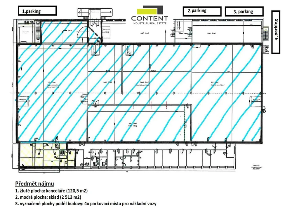 V zastoupení majitele a bez provize nabízíme industriální prostory vhodné pro sklad nebo výrobu o velikosti 2513 m², umístěné v průmyslovém areálu, nedaleko dálnice D5, EXIT 67.