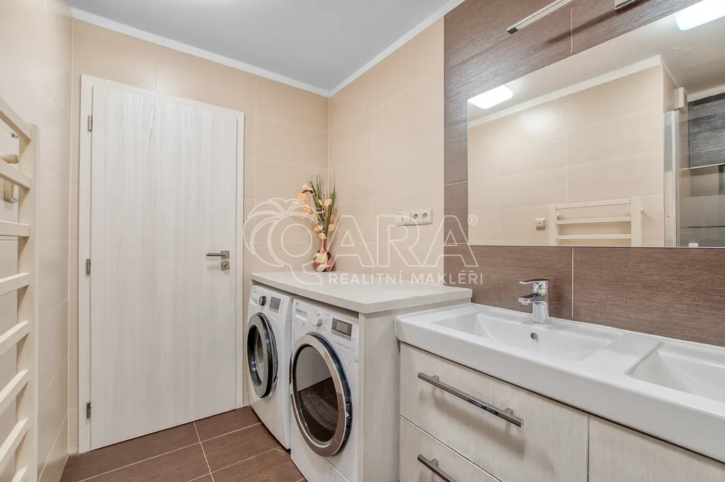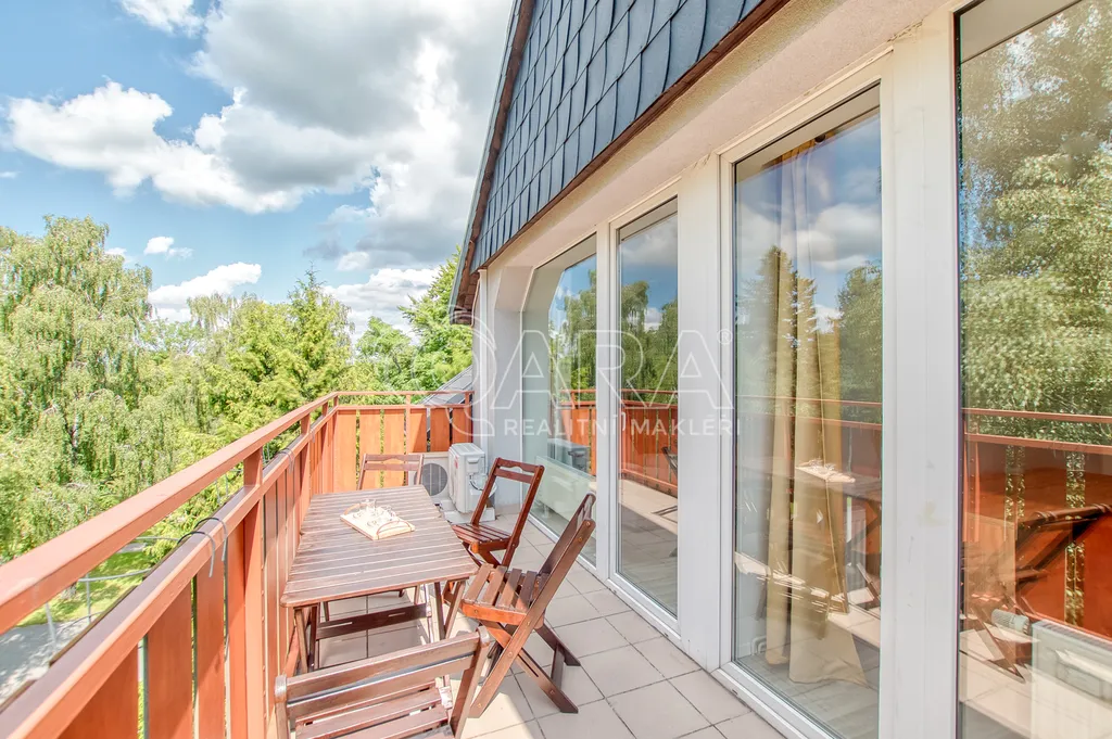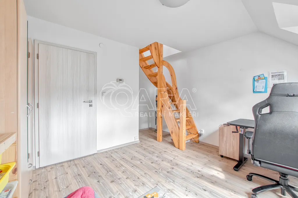 Při vstupu do bytu se z prostorné chodby dostanete na samostatnou toaletu a do moderní koupelny. Dále se byt otevírá do hlavního obytného prostoru, kterým je obývací pokoj s kuchyňským koutem. Z hlavní ložnice je pak stejně jako z ovýváku, přímý vstup na jedinečnou terasu, která je ideálním místem pro ranní kávu i večerní relaxaci. Naproti koupelně se nachází útulný dětský pokoj, ze kterého se po točitých schodech dostanete do podkrovního pokojíčku. Tento prostor je jako stvořený pro domácí pracovnu, ale věříme, že si ho děti na první pohled zamilují a udělají si z něj svůj soukromý koutek.