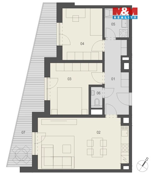 Byt nabízí praktickou dispozici: obývací pokoj s kuchyňským koutem, ložnici, další pokoj, koupelnu s vanou a samostatné WC. Vstup na balkon je ze všech místností, což zajišťuje dostatek světla a příjemné propojení s venkovním prostorem. Interiér je moderní, vybaven kvalitními spotřebiči a designovým LED osvětlením.