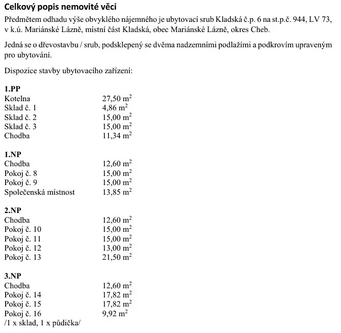 Nájem stavby ubytovacího zařízení Kladská č.p. 6 na stavebním pozemku parcelní číslo 944, k.ú. Mariánské Lázně, místní část Kladská, obec Mariánské Lázně