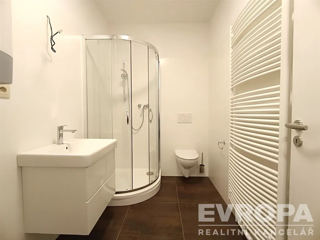 Za vstupními dveřmi je předsíň, ze které se vchází do koupelny se sprchovým koutem a toaletou, kuchyně spojené s obývacím pokojem, která je průchozí do ložnice. Kuchyňská linka je plně vybavena vestavěnými spotřebiči (el. sporák s troubou a sklokeramickou deskou, lednicí s mrazákem). V obývacím pokoji spojeném s kuchyní, ložnici a předsíni je na podlaze lepený vinil, v koupelně dlažba. K bytu patří sklepní kóje.