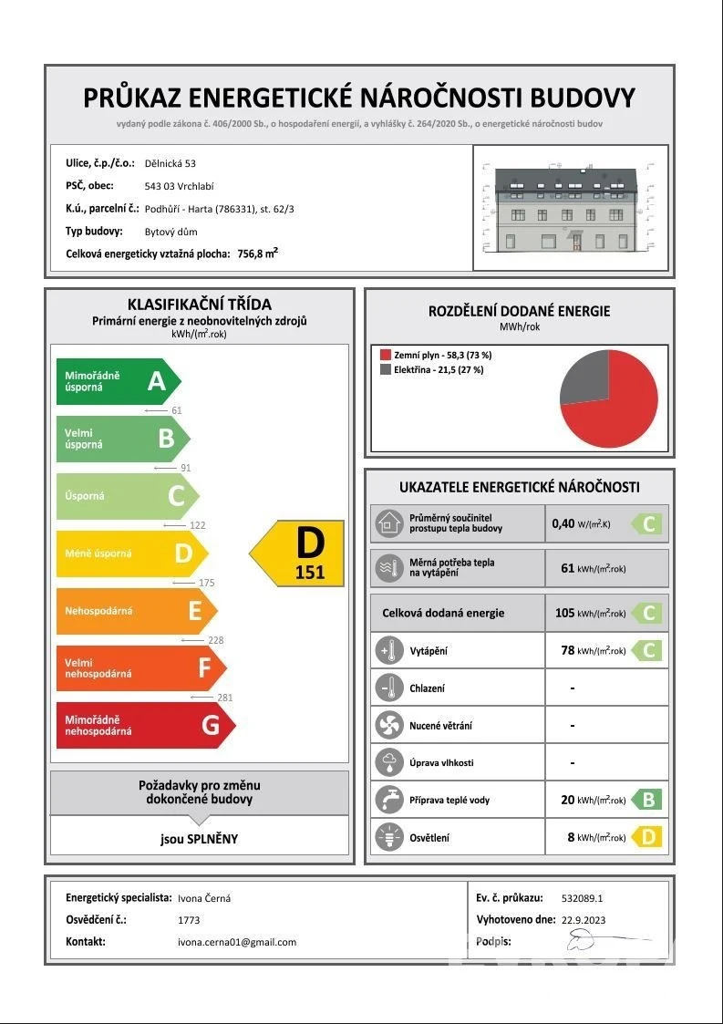 Topení pro celý dům zajišťuje plynový kotel a ohřev TUV el. bojler. Okna jsou plastová s trojskly a směrují na západ. Bytový dům je dostatečně zateplen, PENB uvádí energetickou třídu D.