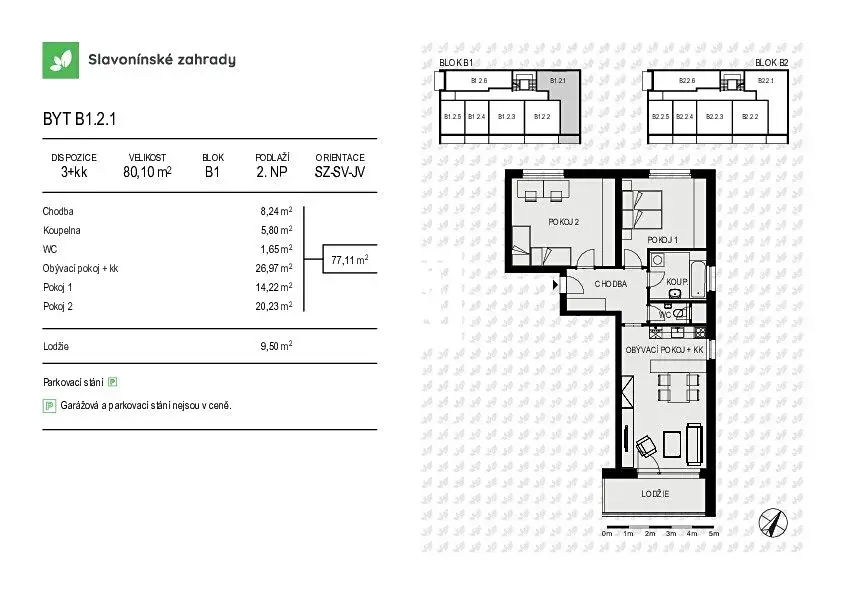Byt B1.2.1 o dispozici 3+kk má podlahovou plochu 80,1 m², terasa o velikosti 9,5 m² a nachází se ve 2.NP bytového domu s nízkým počtem bytových jednotek.