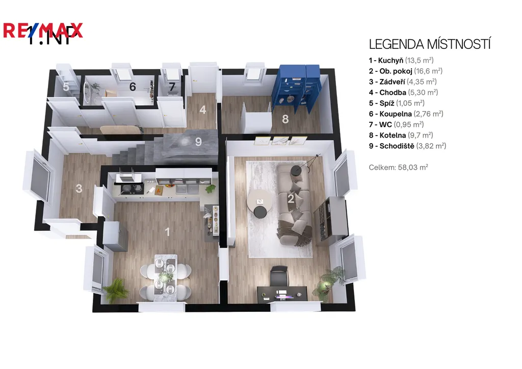 Dům je dispozičně řešen jako 3+1, a to nabízí možnost jak flexibilního uspořádání interiéru, tak komfortního bydlení. Užitná plocha činí 61 m², celková plocha 91 m². K domu náleží i sklep o velikosti 3 m² a dále pak sklep na hranici pozemku, což poskytuje další úložný prostor.