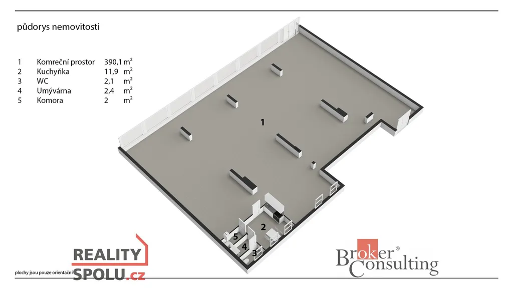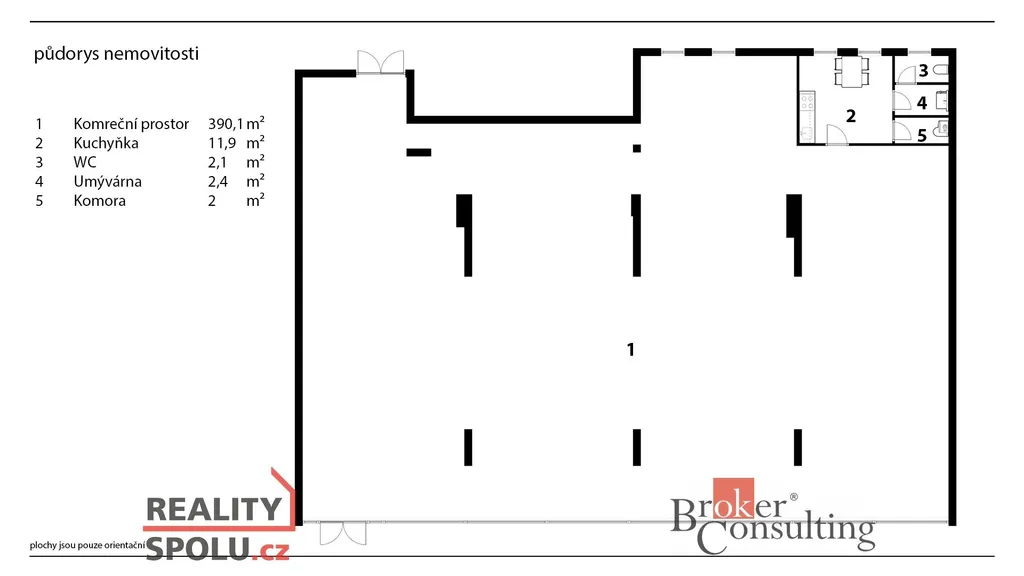 Dispozičně je možné prostor ponechat jako jeden celek, případně jej rozdělit příčkou na dvě samostatné jednotky o výměře 90 m² a 305 m², přičemž obě mohou mít vlastní vstup z hlavní ulice. U menší jednotky byl v minulosti samostatný vstup, který je možné znovu obnovit. Další vstup do prostoru je možný také ze zadní části objektu, z prostoru vnitrobloku, kde se nachází soukromé parkování se závorou, vhodné zejména pro zásobování.