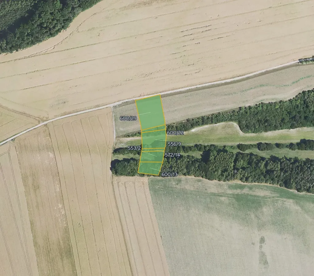 Jedná se o parcely č. 553/2, 556/9, 572/14, 600/13, 600/22 a 600/29 o celkové výměře 8 317 m². Pozemky jsou vedeny jako orná půda, lesní pozemek, ostatní plocha a vodní plocha.