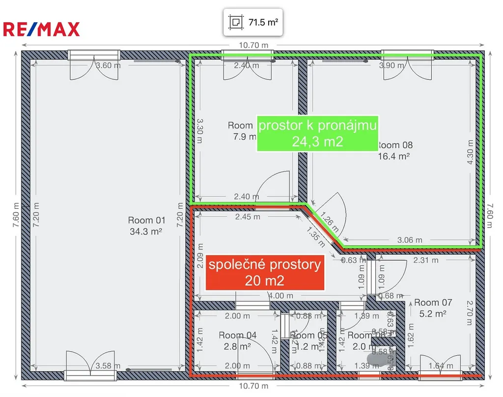 Samotný objekt je jednopodlažní, nepodsklepená budova obdélníkového půdorysu, s valbovou střechou bez využitelného podkroví. Podlahová plocha domu je 72 m², plocha zahrady včetně parkovacích míst je 835 m². Novému nájemníkovi bude k dispozici cca polovina objektu o podlahové ploše 35 m².