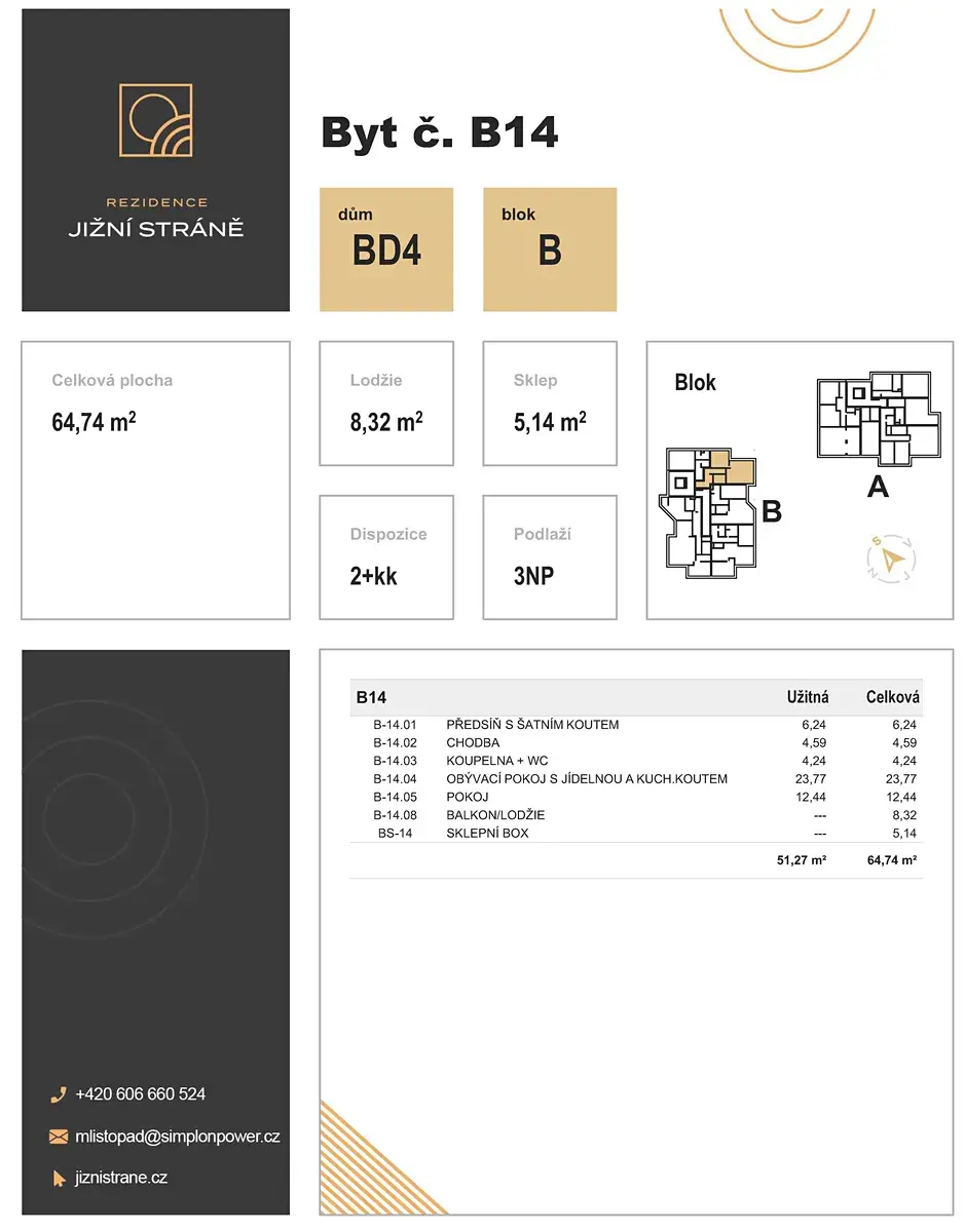 Do této kategorie patří i prezentovaný byt s označením BD4_B14 o dispozici 2+kk s celkovou plochou 64,74 m² (byt 51,27 m², balkon 8,32 m², sklep 5,14 m²).